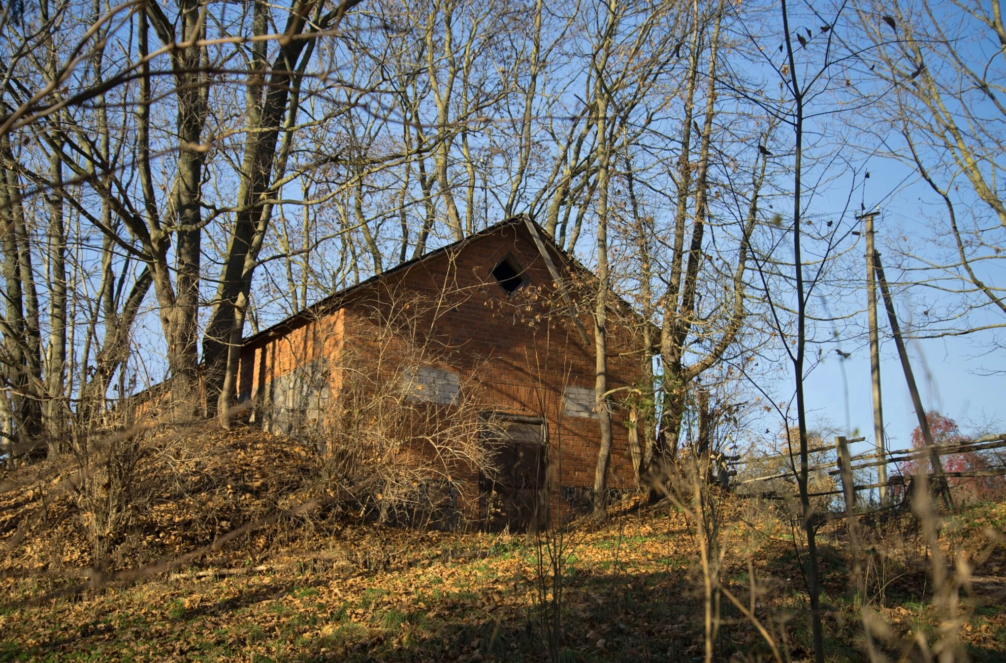 Архитектурный облик храма частично скрыт разросшейся растительностью: кустарники и деревья плотно обступили здание, а сухая трава и оголённые ветви указывают на осенний период съёмки. Несмотря на плачевное состояние, сооружение сохраняет свои архитектурные пропорции и величие, напоминая о былом духовном значении этого места.