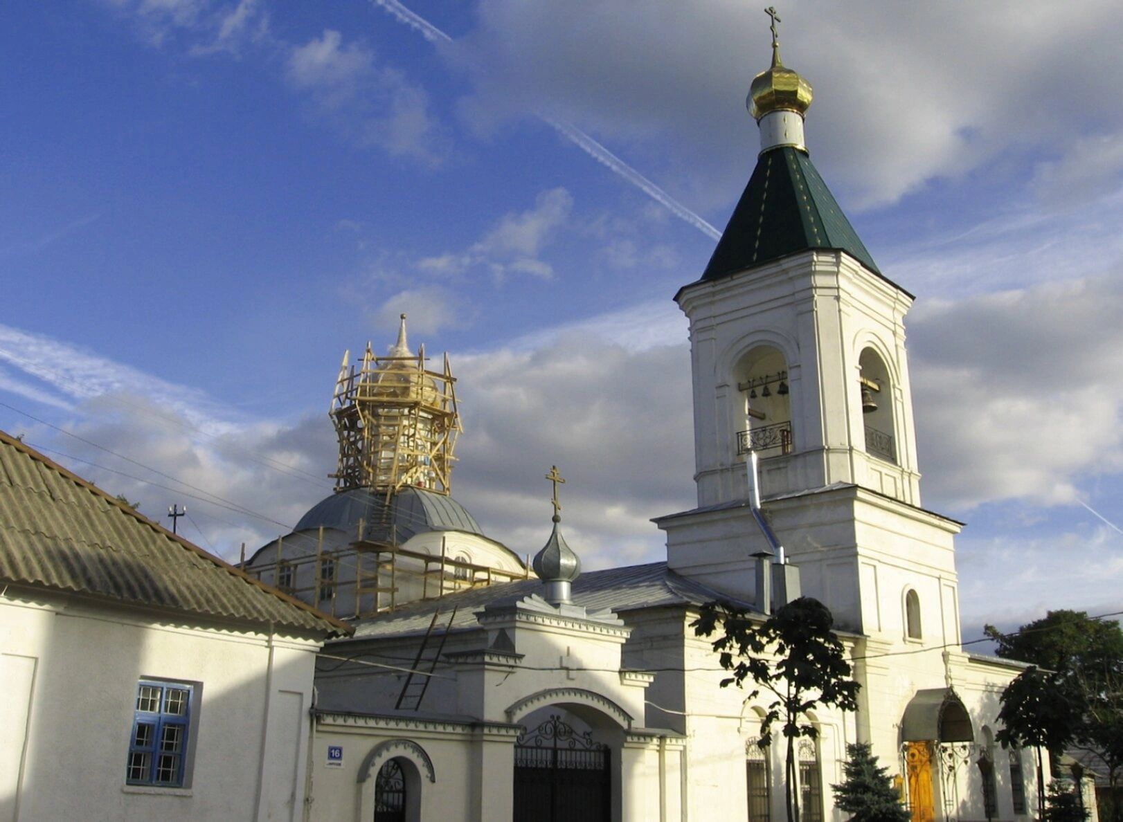 На заднем плане фотографии видно чистое небо с лёгкими облаками и инверсионными следами, что добавляет снимку динамичности и контраста между земным и небесным. Храм, несмотря на ведущиеся работы, сохраняет свой величественный вид и продолжает оставаться важным центром духовной жизни города.