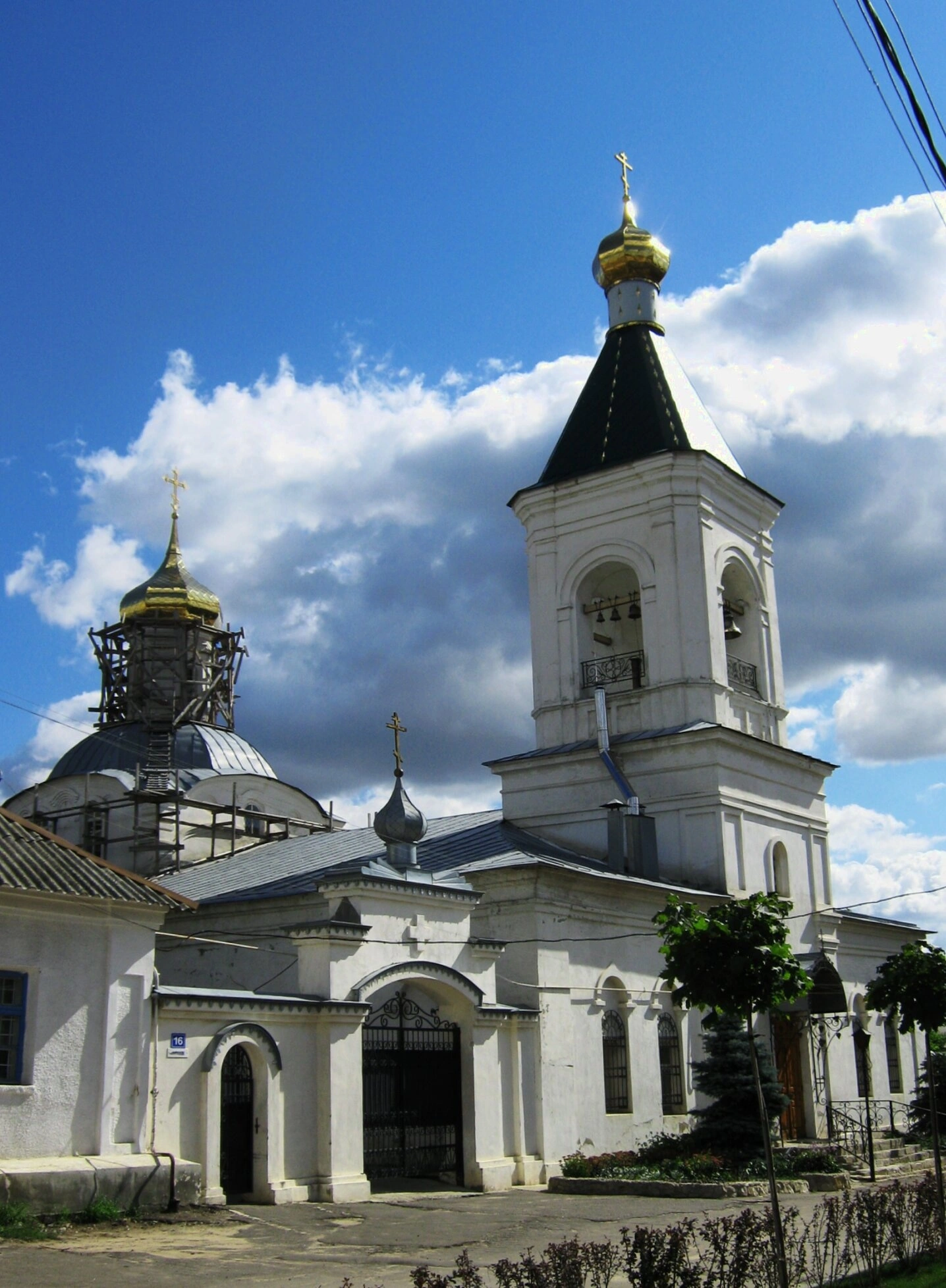 На заднем плане видна часть основного объёма церкви, который в момент съёмки находился на реставрации, о чём свидетельствуют установленные строительные леса. Исторически здание храма формировалось в течение нескольких веков, а его старейшие части, датируемые серединой XVIII столетия, являются ценным примером архитектурного стиля барокко в церковном строительстве центральной России.