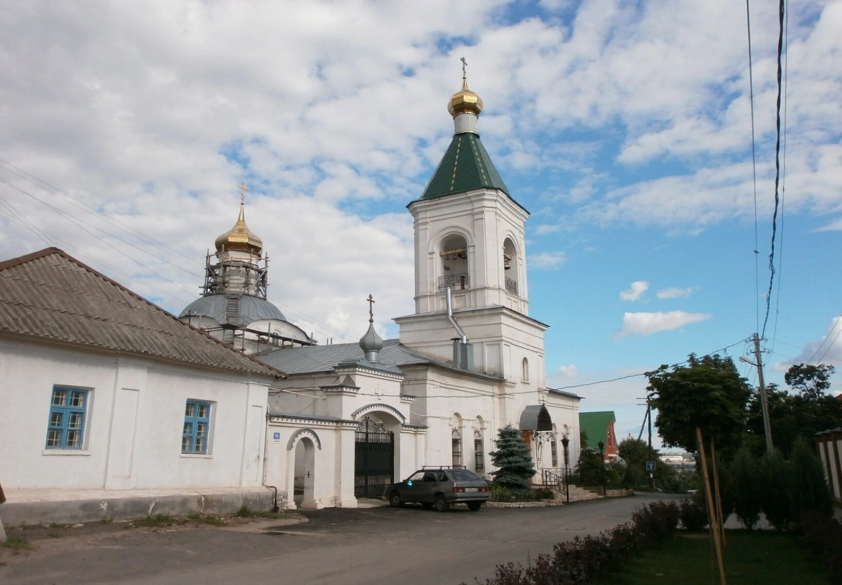 На переднем плане фотографии видна дорога и элементы благоустройства, включая зелёные насаждения. Слева от храма располагается здание причта или церковной лавки. Припаркованный автомобиль и столбы линий электропередач указывают на расположение святой обители в городской среде, что подчёркивает неразрывную связь духовной жизни с повседневностью. Храм, исторически известный также как Спасская церковь, является неотъемлемой частью исторического облика Воронежа и свидетельствует о глубоких православных традициях этого края.