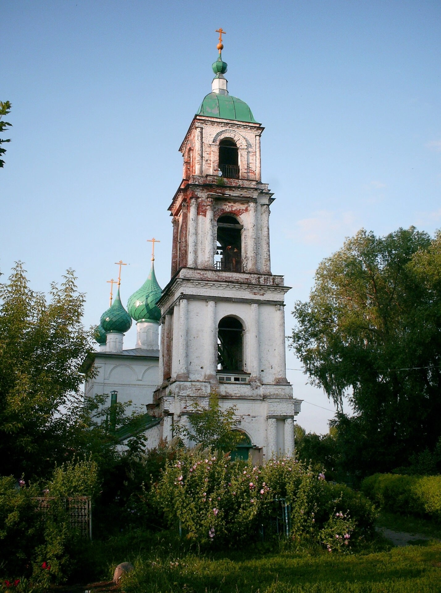 На снимке хорошо просматривается монументальная колокольня храма, увенчанная зелёным куполом с установленным на нём крестом. Архитектурные формы сооружения демонстрируют традиции русского церковного зодчества. Стены колокольни сохраняют следы времени, что придаёт сооружению особую историческую ценность и духовную значимость.