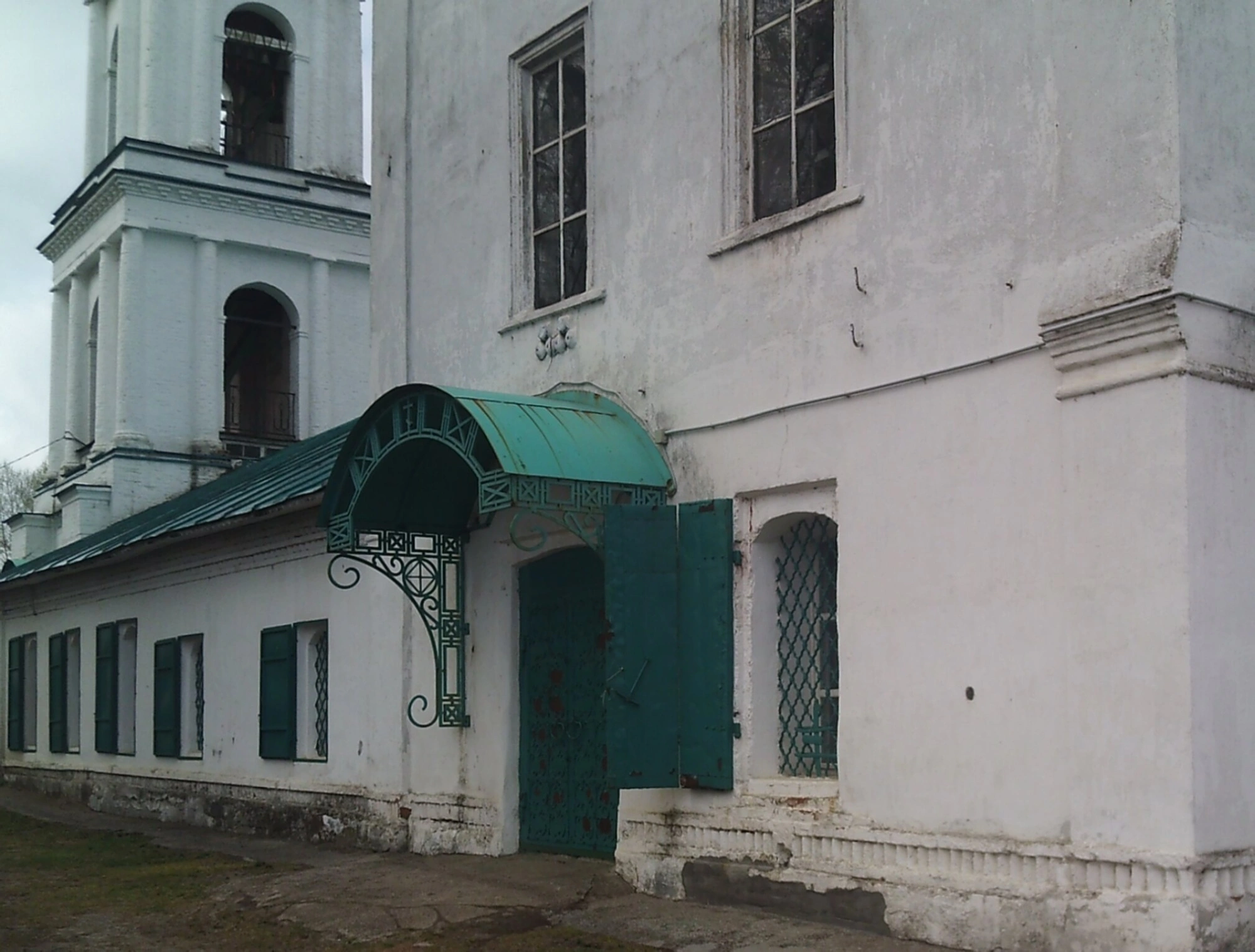 На переднем плане изображения вниманию предстаёт пристройка с зелёной кровлей, характерной для традиционного русского храмового строительства. Ярким акцентом служит массивная зелёная дверь, украшенная арочным козырьком с изящными коваными элементами, что свидетельствует о высоком мастерстве кузнецов. Рядом расположено окно, защищённое декоративной решёткой, выполняющей как охранительную, так и эстетическую функцию.