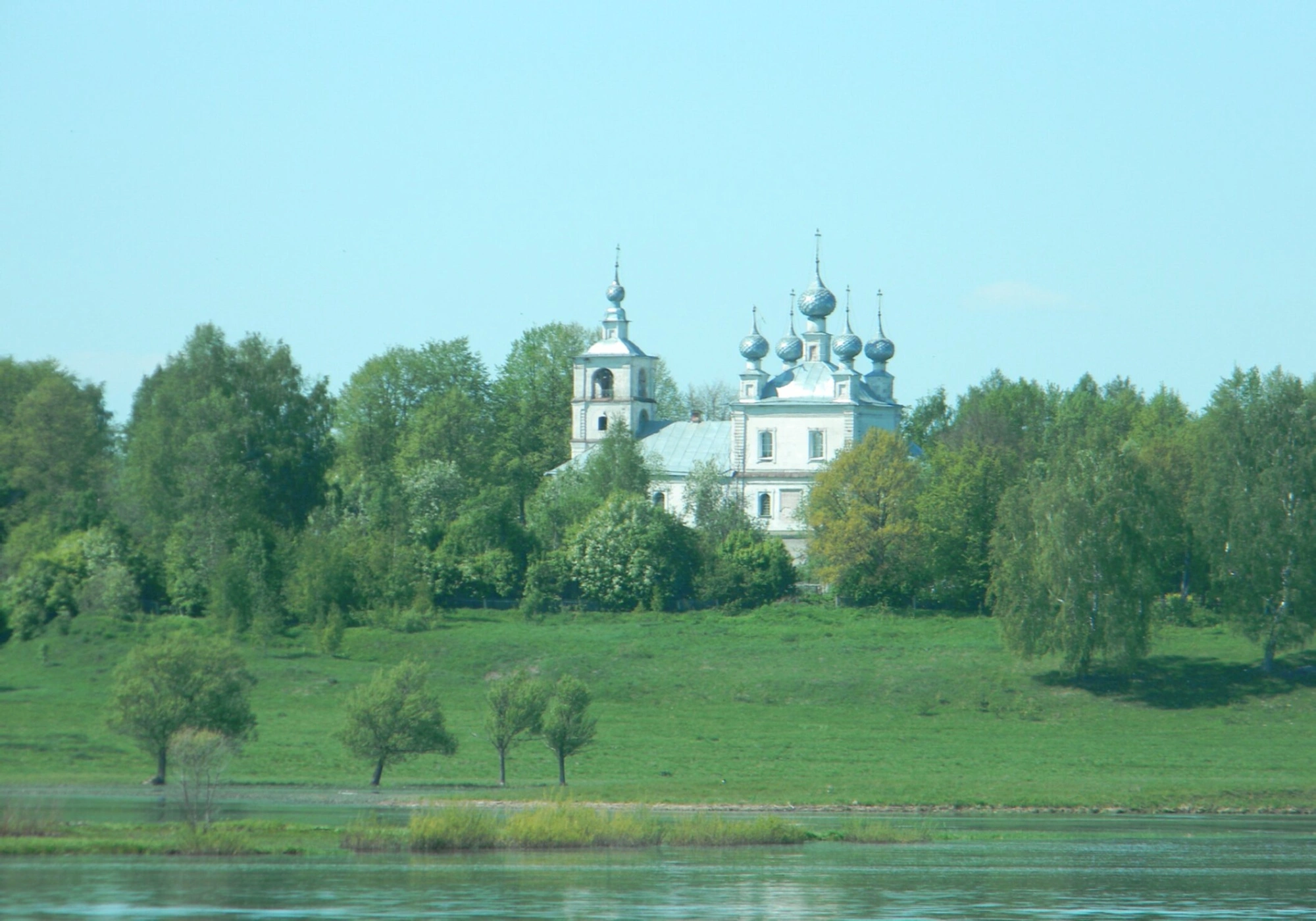 На представленной фотографии запечатлён величественный православный храм — Церковь Спаса Преображения Господня, расположенная в селе Поводнево Мышкинского района Ярославской области. Святыня живописно возвышается на берегу реки Волги, являясь неотъемлемой частью историко-культурного ландшафта этого края.