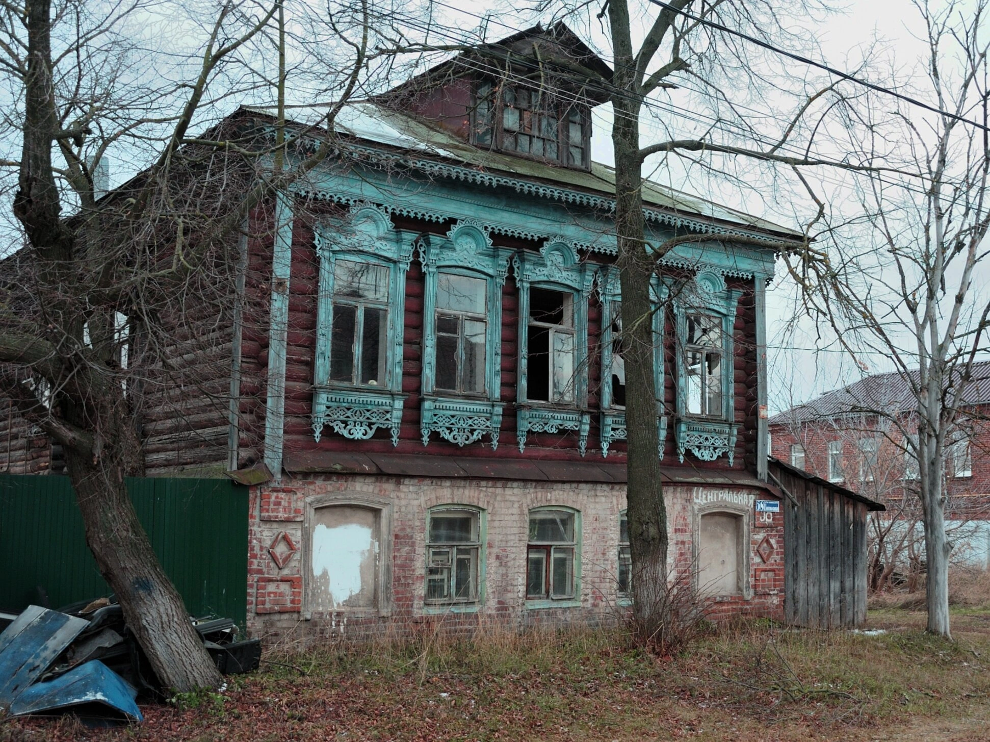На момент создания фотографии храм пребывает в ветхом состоянии: краска на стенах облупилась, кровля имеет повреждения, декоративные элементы показывают следы естественного износа. Окружающий пейзаж дополняют голые деревья, что указывает на осенне-зимний период, а на заднем плане виден другой кирпичный дом, составляющий архитектурный ансамбль. С левой стороны композиции находится зеленый забор, ограждающий церковную территорию.