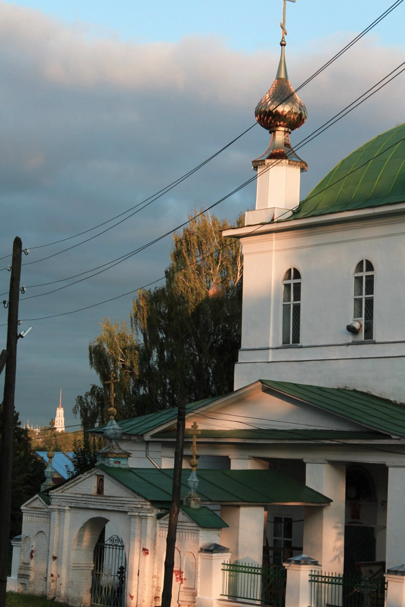 На переднем плане фотографии изображена каменная ограда храмовой территории и часть входной группы, оформленная в виде арки. За церковными стенами виднеются кроны деревьев, создающие естественное обрамление для святыни. На заднем плане, в легкой дымке, просматривается еще один шпиль с крестом, вероятно принадлежащий соседнему храму.