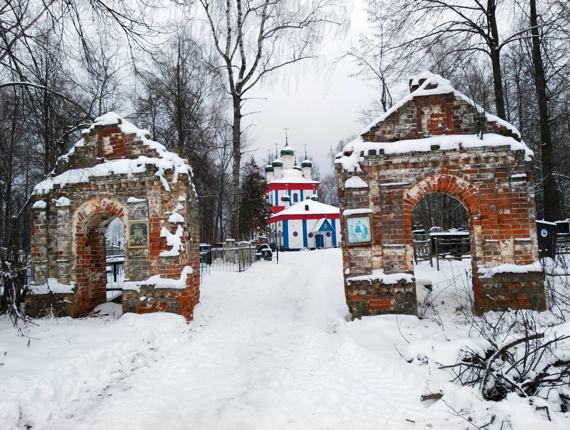 Зимний пейзаж, окружающий церковь, придаёт снимку особую атмосферу умиротворения и благоговейной тишины. Голые ветви деревьев подчёркивают величие и монументальность святого места. Несмотря на следы времени, читаемые в разрушенных элементах ворот, сам храм сохраняет свой величественный вид, напоминая о вечности и непреходящей духовной силе православной веры. Данный образ служит напоминанием о богатом историческом и культурном наследии России, нуждающемся в сохранении и молитвенном почитании.