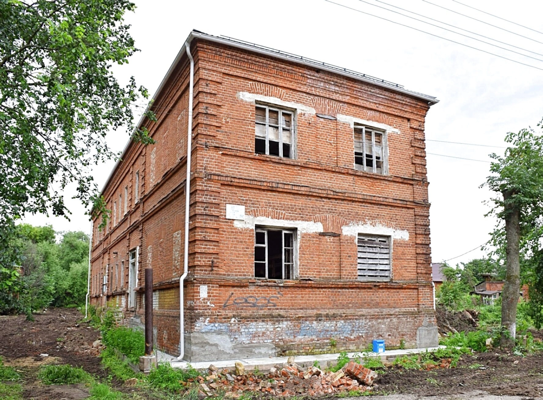 Двухэтажное кирпичное здание бывшего храма демонстрирует признаки разрушения: нарушена целостность кирпичной кладки, оконные проёмы частично лишены рам, а сохранившиеся заколочены деревянными щитами. Белая водосточная труба, сохранившаяся на фасаде, свидетельствует о былой заботе о святом месте.