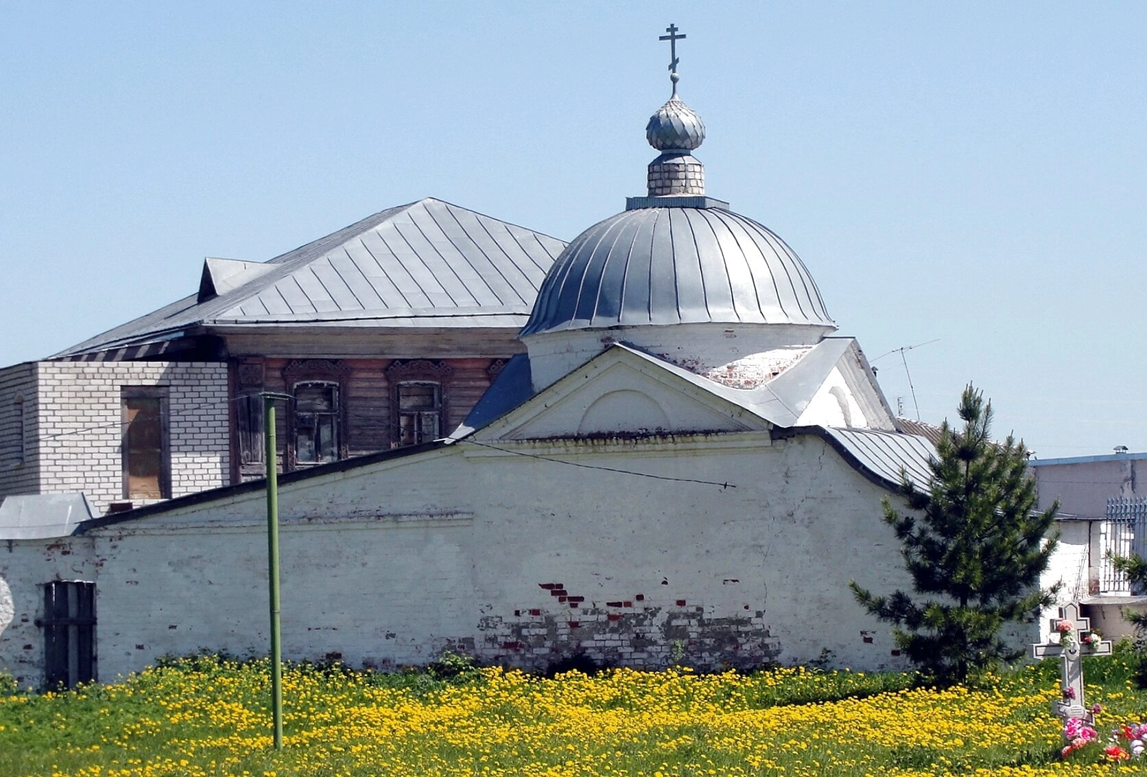 На переднем плане фотографии виден живописный летний луг, покрытый ярко-желтыми одуванчиками, создающими особую атмосферу умиротворения и природной гармонии. Среди цветочного ковра установлен небольшой поклонный крест, украшенный искусственными цветами, что свидетельствует о почитании этого святого места верующими.