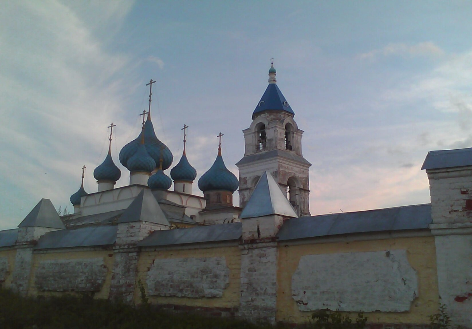 На переднем плане снимка у подножия церковной ограды виднеется естественная растительность — зеленая трава и кустарники, что подчеркивает гармоничное единство творения Божия и рукотворного храма. Пасмурное небо с облаками на заднем плане создает атмосферу тишины, благоговения и вечности, характерную для православных святынь.