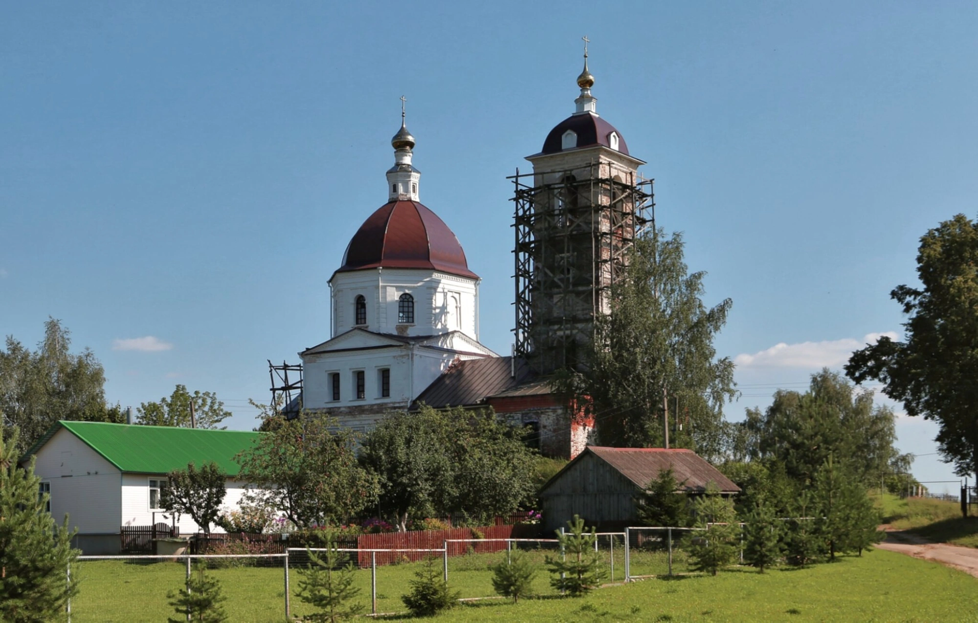 Архитектурный ансамбль включает в себя основной храмовый объем, увенчанный коричневым куполом, и колокольню с меньшим куполом такого же цвета. На момент съемки вокруг колокольни установлены строительные леса, что свидетельствует о проведении реставрационных работ, направленных на сохранение этого духовного центра.