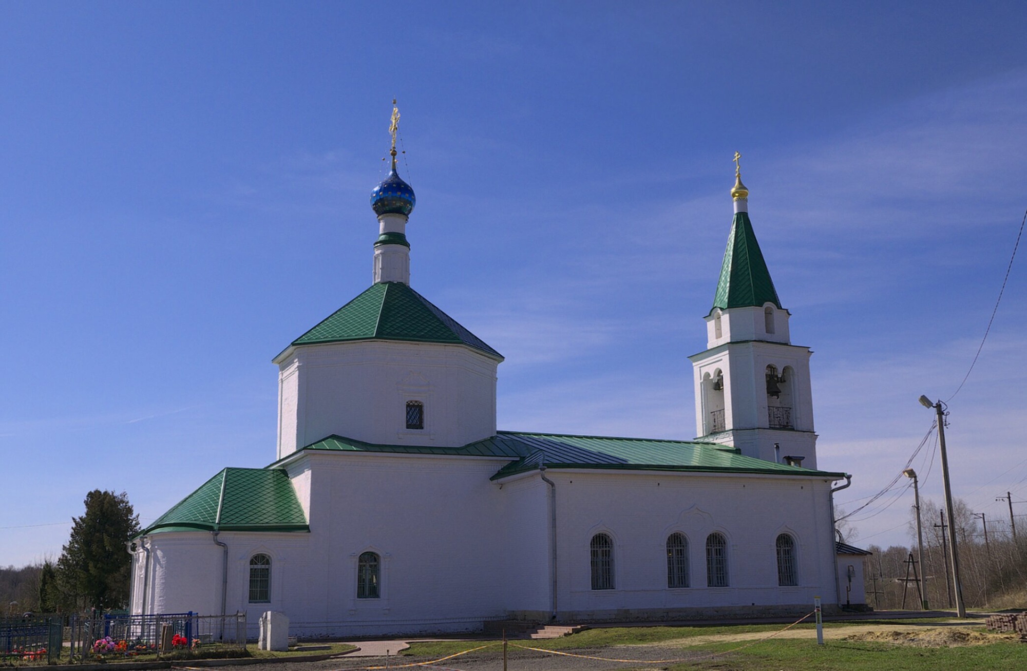 Территория вокруг храма благоустроена, просматривается грунтовая дорога и ограждение. На заднем плане виднеется типичный среднерусский пейзаж с растительностью и линиями электропередач. Фотография сделана в ясный солнечный день, что подчёркивает величие и красоту святыни на фоне голубого неба.