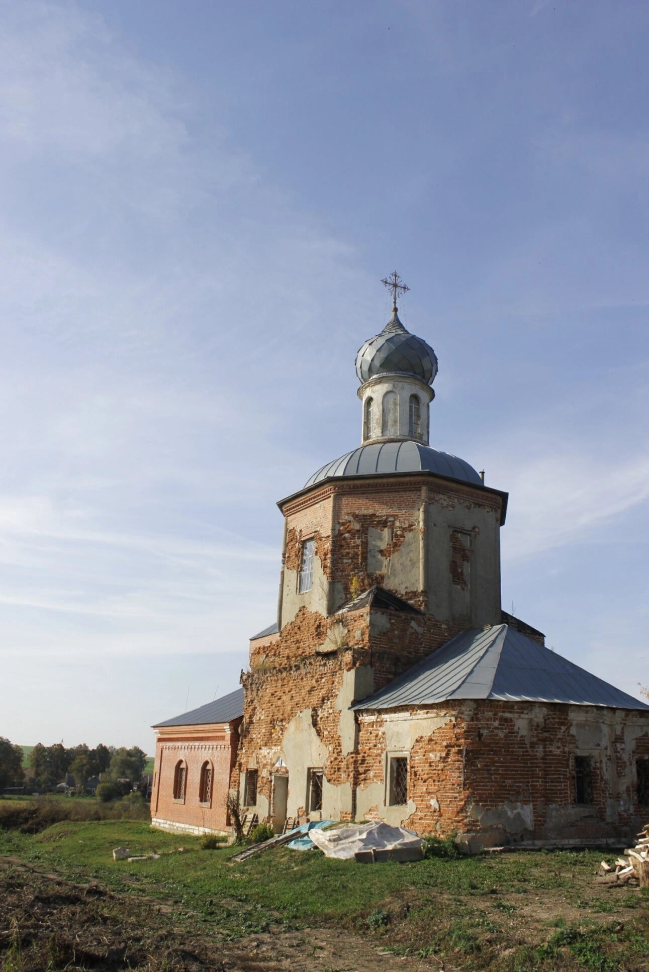 К основному зданию примыкает более поздняя кирпичная пристройка, которая, судя по внешнему виду, подверглась меньшим разрушениям. Отсутствие оконных заполнений и повреждения стеновых конструкций свидетельствуют о длительном нахождении храма в заброшенном состоянии. Храм расположен на открытой местности, окружённой травянистыми пространствами, что создаёт особую атмосферу уединённости и духовной сосредоточенности.