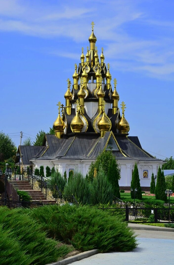 На фотографии запечатлён величественный православный храм — Церковь Спаса Преображения Господня, являющаяся центральным соборным храмом Усть-Медведицкого Спасо-Преображенского женского монастыря. Святая обитель располагается в живописной местности на правом берегу реки Дон, в черте города Серафимович Волгоградской области.