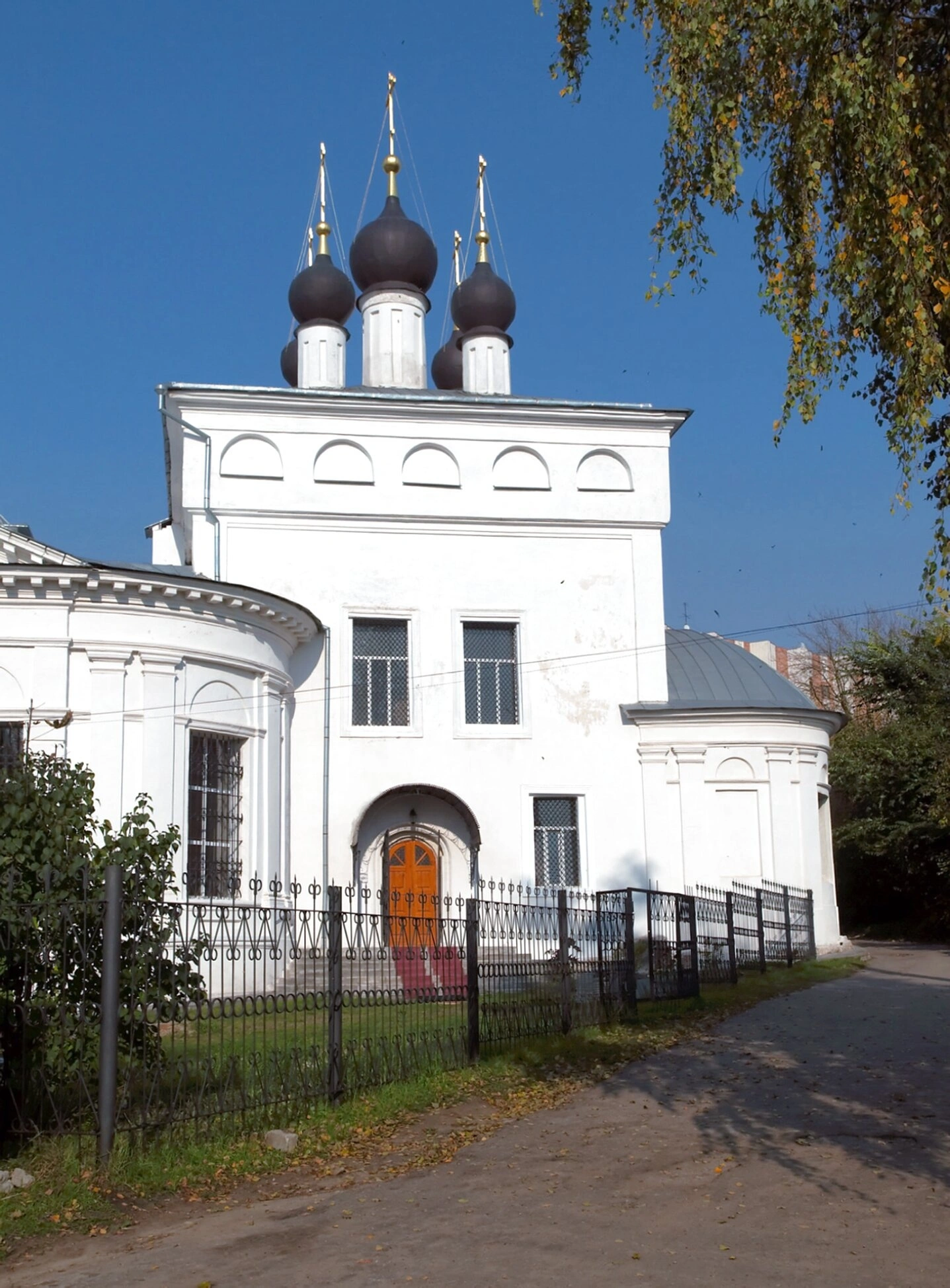 Храмовая территория обнесена ажурной металлической оградой, за которой виднеется ухоженная зелень. Осенняя листва деревьев, окружающих церковь, создаёт прекрасное живописное обрамление для духовного центра. Прихрамовая грунтовая дорога напоминает о пути, который верующие совершают к дому Божиему.