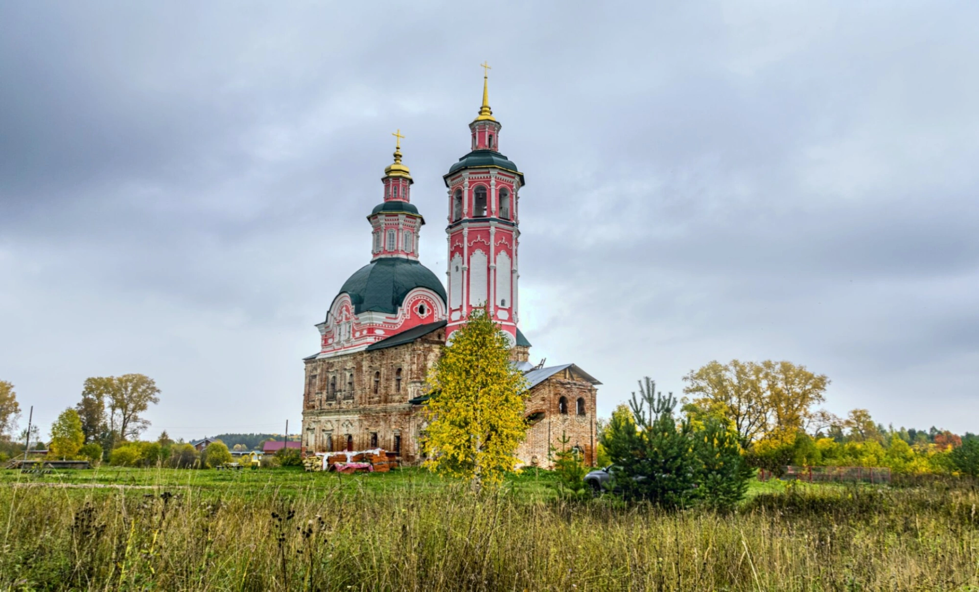 Яркий облик храма создаётся за счёт контрастного сочетания красного кирпича и белых декоративных элементов, что характерно для храмового зодчества данного периода. На фотографии храм предстаёт в обрамлении скромной русской природы: на переднем плане видны хвойные деревья, а вокруг раскинулось поле с осенней растительностью и жёлтой листвой. Пасмурное осеннее небо с облаками придаёт всей композиции особое, созерцательное настроение, подчёркивая умиротворённость и духовную значимость этого места.
