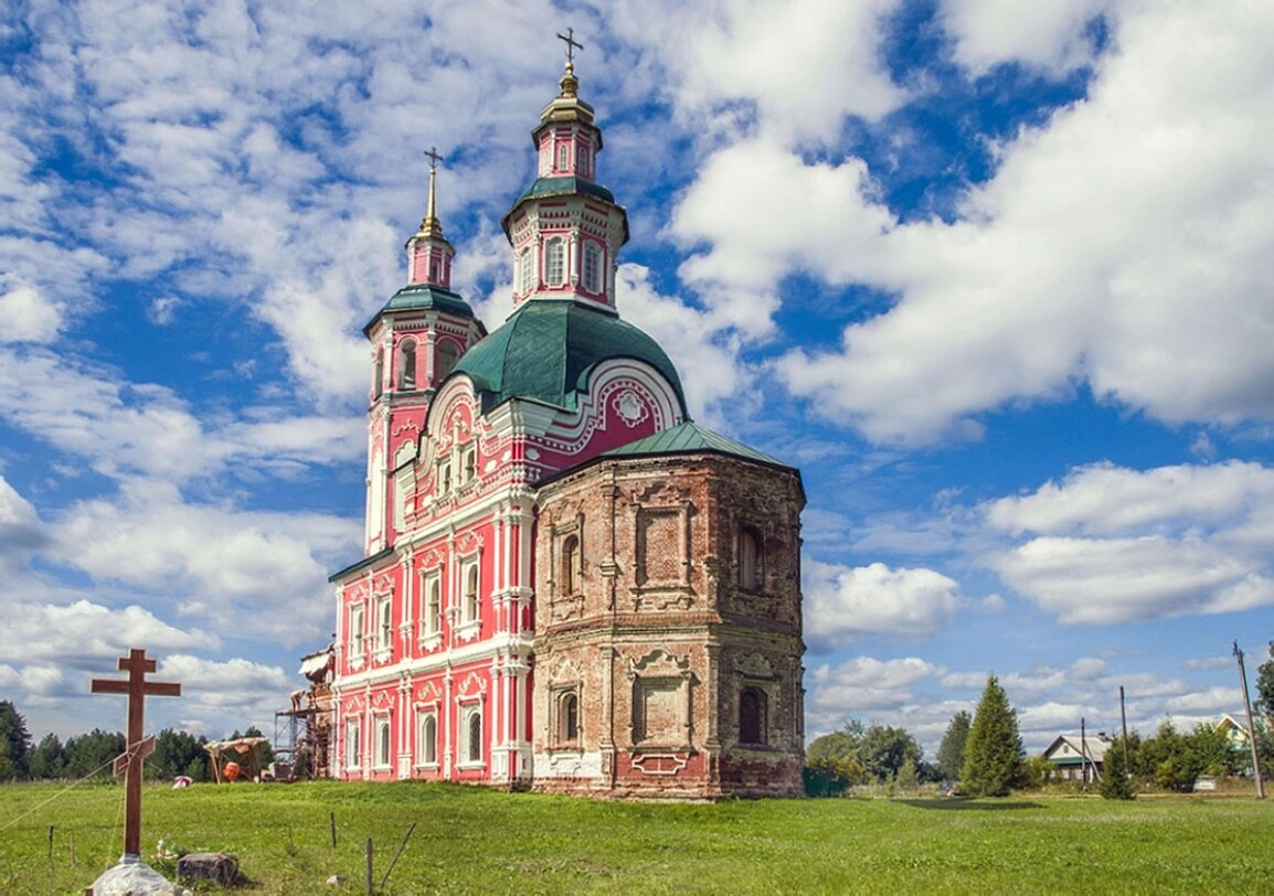 Храм располагается на живописном зелёном поле, окружённом древесными насаждениями и типичным сельским пейзажем. На переднем плане слева установлен деревянный православный крест на каменном основании, что добавляет композиции сакрального смысла. Небесный свод с пышными белыми облаками создаёт величественный фон для церковного строения.