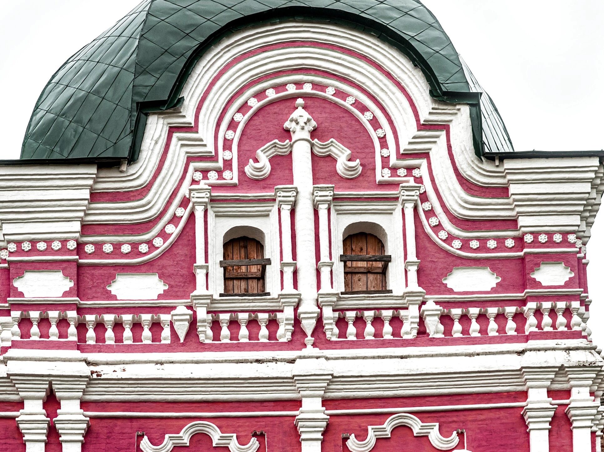 Архитектурное решение включает многочисленные белые детали: балясины, колонны, профилированные карнизы и мелкие декоративные элементы, напоминающие жемчужины. Особого внимания заслуживают оконные проемы, обрамленные изящными наличниками с колонками и сандриками-бровками. Подоконное пространство украшено филёнками-картушами, характерными для декоративного убранства храма.