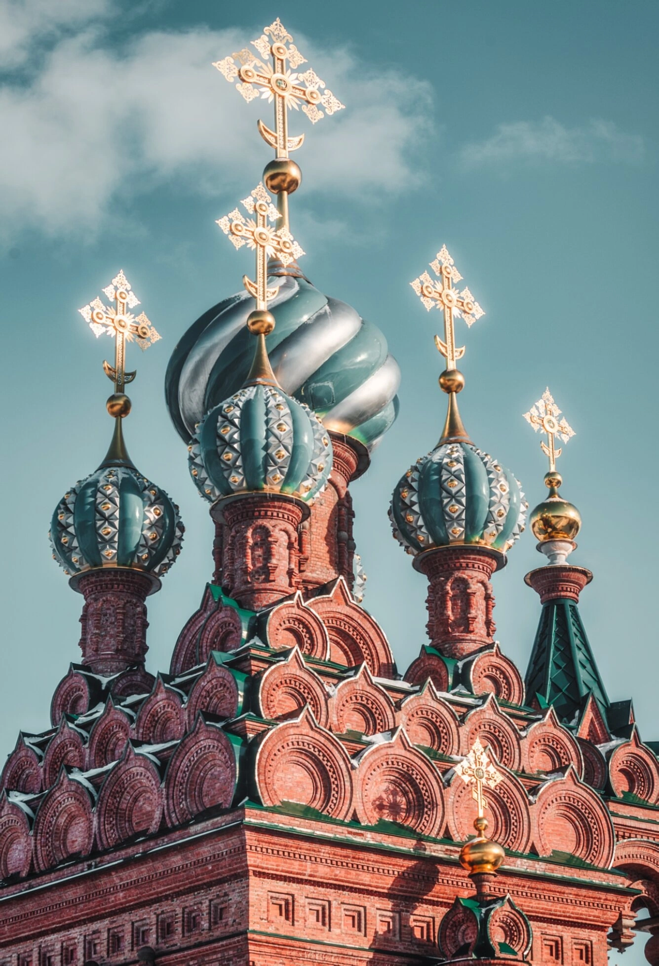 Кирпичная кладка тёплого красного оттенка, виднеющаяся в основании, свидетельствует о традициях русского церковного зодчества. На светлом фоне небес с легкими облаками ярко выделяются благодатные символы православной веры, создавая образ неземной красоты и духовного торжества. Вся композиция фотографии передаёт атмосферу благолепия, молитвенного покоя и благодати, свойственной этому святому месту.