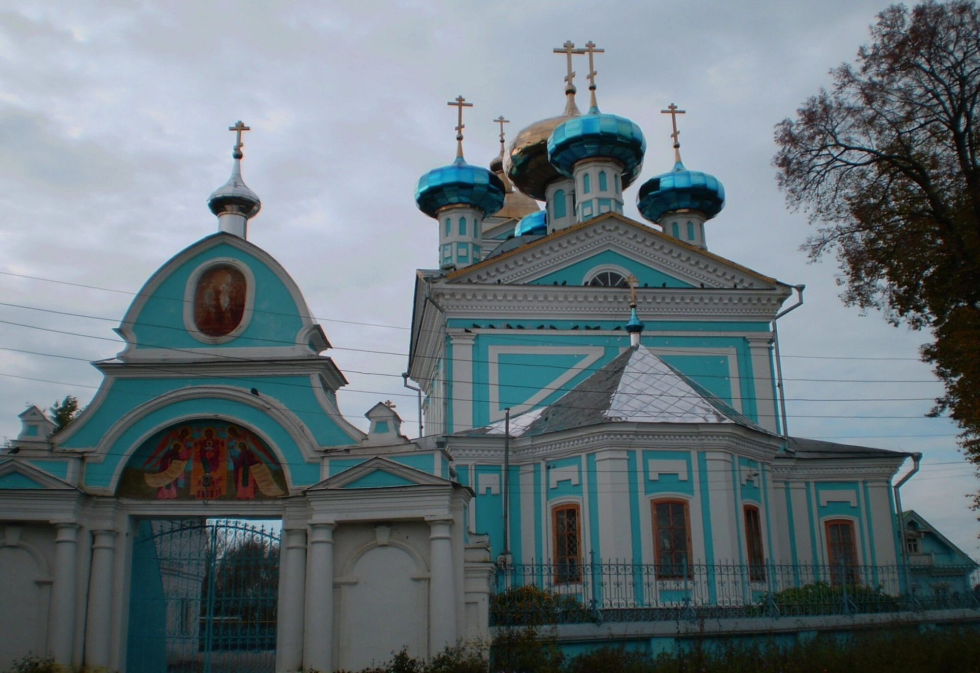 Пятиглавый собор, выполненный в традициях русского классицизма, dominates панораму своими лазурными куполами, увенчанными златыми крестами. Четверик основного объема храма украшен изящными оконными наличниками и окрашен в благолепные светло-голубые тона, что создает ощущение небесной чистоты и благодати. Каждый из пяти куполов украшен изящными белыми орнаментами, подчеркивающими церковное великолепие.