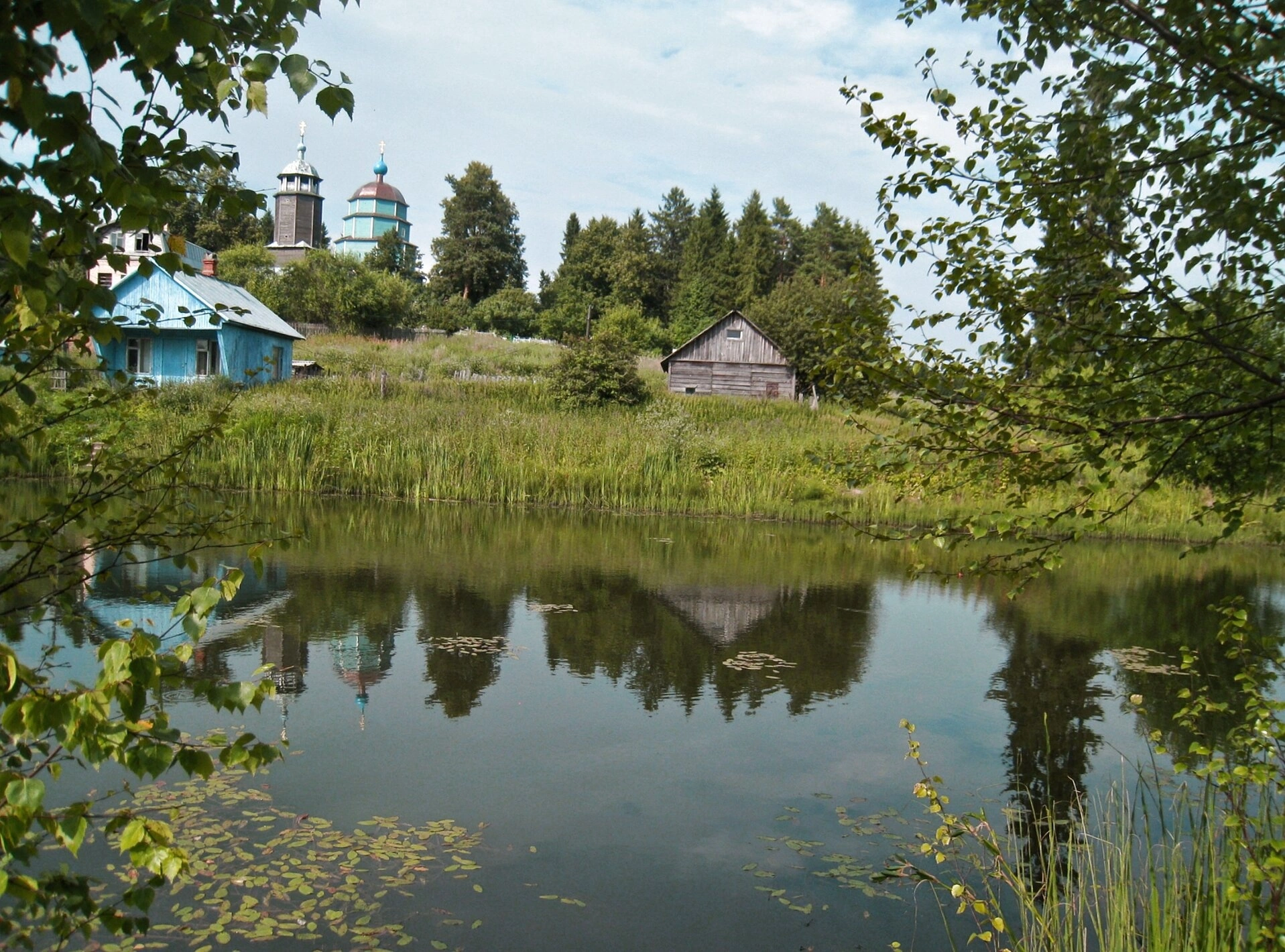 На заднем плане, вдоль берега и рядом со святыней, располагаются скромные деревянные дома, характерные для русской деревни. Пышная зелёная растительность — высокие деревья, кустарники и трава — обрамляет весь вид, подчёркивая единство творения рук человеческих и Божьего мира. Частично облачное небо дополняет композицию, наполняя её светом и воздухом.