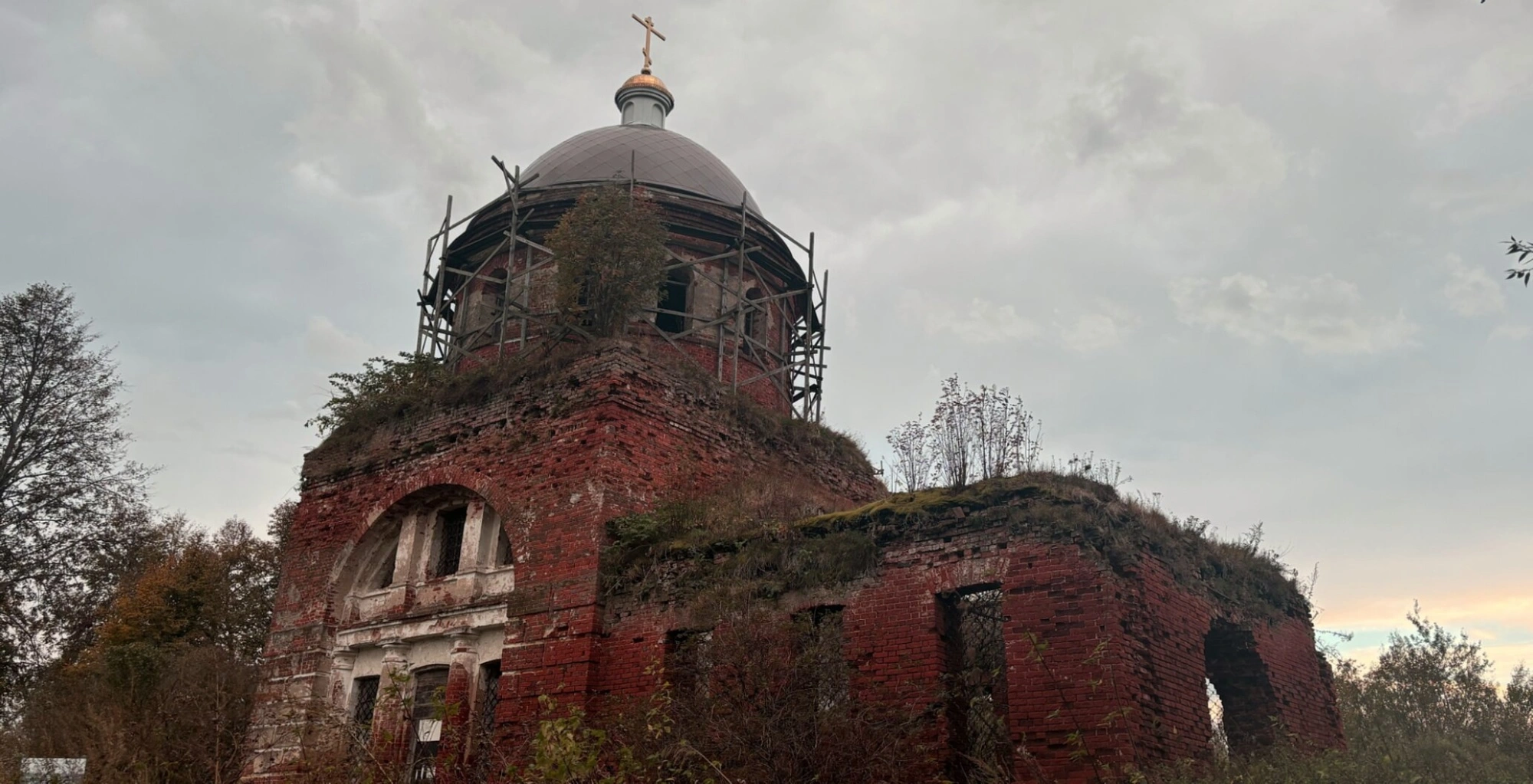 Храм сильно пострадал от времени и воздействия природных факторов. Крыша и стены обильно поросли травой и кустарником, а вокруг здания раскинулись деревья, создающие меланхоличный пейзаж. Пасмурная погода с серыми облаками усиливает ощущение утраты и забвения, но одновременно подчеркивает духовную значимость этого места.
