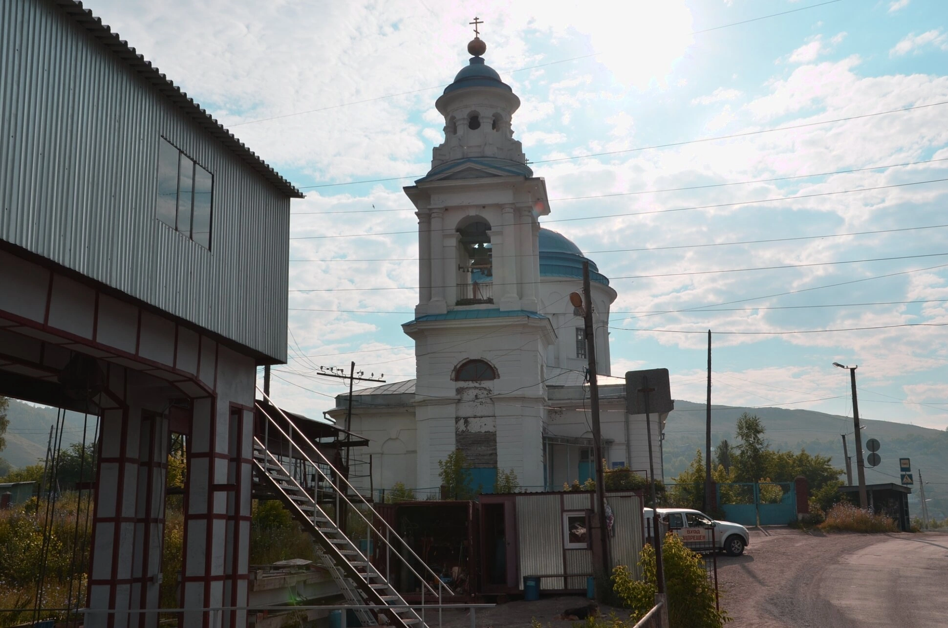 С правой стороны от храма проходит грунтовая дорога, а слева располагается хозяйственное строение, обшитое металлическим сайдингом и оборудованное наружной лестницей. На заднем плане открывается живописный вид на холмистую местность, характерную для Южного Урала. Фотография сделана в ясный солнечный день, когда небо покрыто легкими облаками, что создает особую световую атмосферу и подчеркивает величие православной святыни.