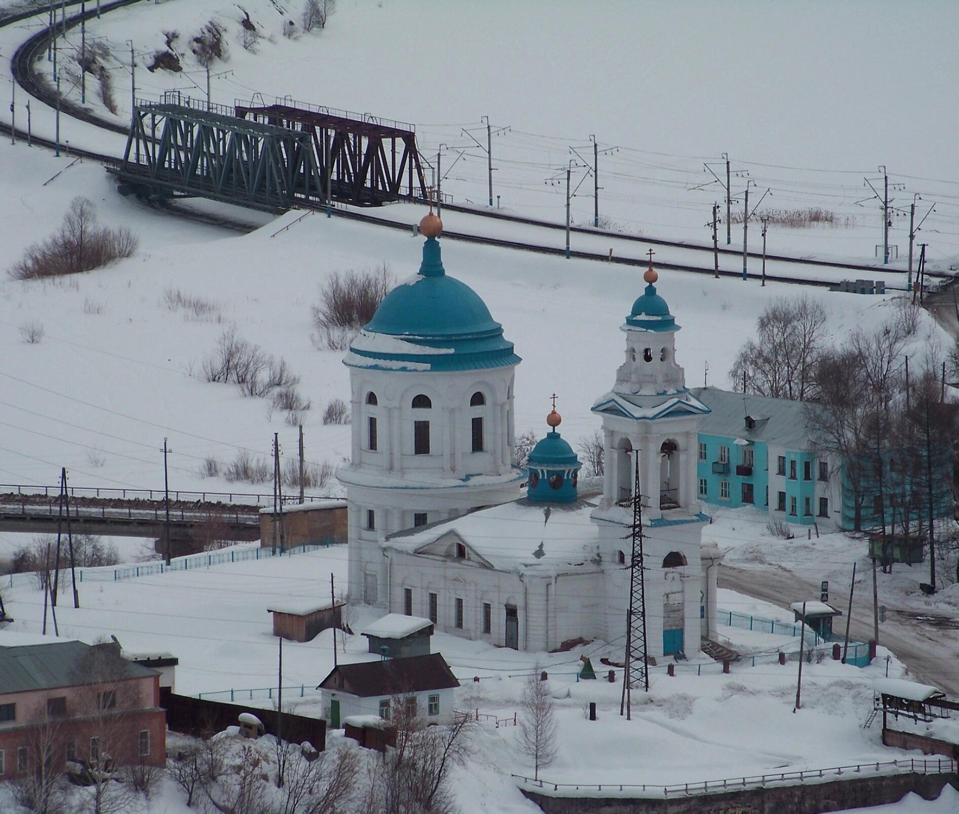 Храм возведён на возвышенности, что подчёркивает его доминирующее положение в окружающем ландшафте. На снимке зафиксирован зимний период - земля покрыта снежным покровом, что придаёт изображению особую атмосферу духовной чистоты и благоговения. На заднем плане просматриваются железнодорожные пути с мостом и жилые строения, свидетельствующие о расположении храма в населённом пункте.