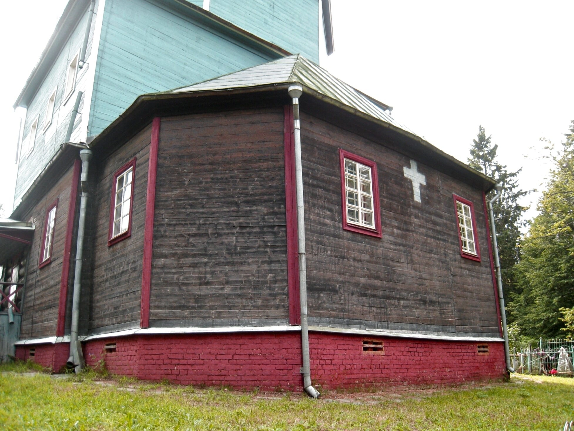 На правой стене храма расположен белый крест — символ христианской веры и спасения. По периметру здания проложены водосточные трубы, обеспечивающие сохранность деревянных конструкций. Кровля церкви выполнена с соблюдением традиционных форм православного храмостроительства.