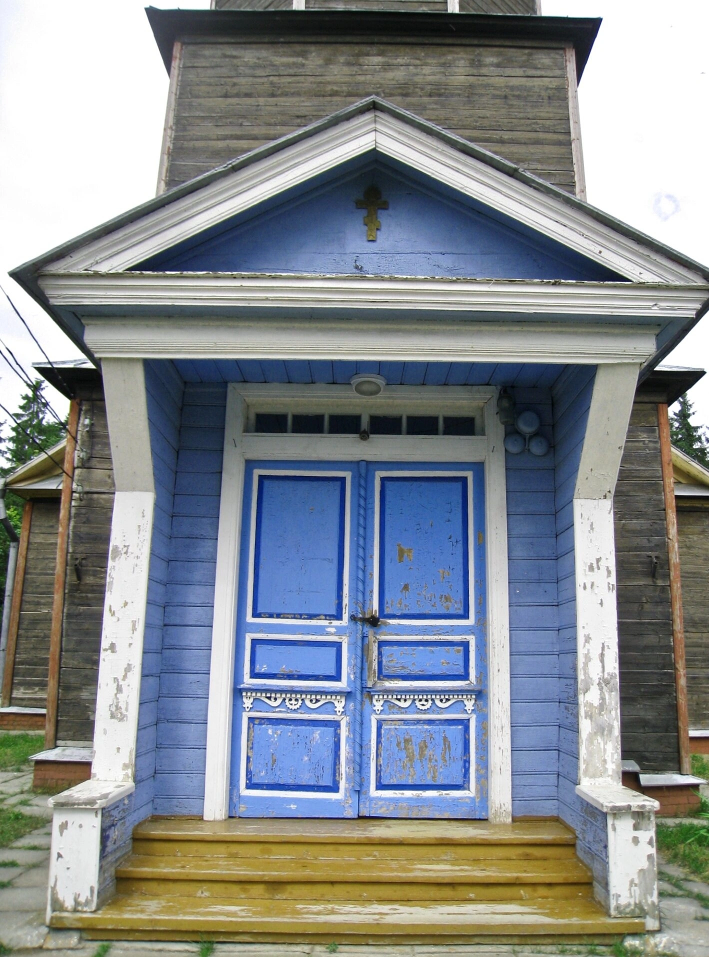 Главный фасад церкви обращён к прихожанам и представляет собой образец традиционного деревянного зодчества. Вход оформлен в виде крыльца с деревянными ступенями и аккуратными белыми перилами, ведущими к двустворчатым дверям. Двери, выкрашенные в глубокий синий цвет, символизирующий небесную чистоту и Богородицу, украшены скромной, но изящной резьбой. Белые рамы и наличники создают светлый, возвышенный контраст. Над входом, на треугольном фронтоне, установлен православный восьмиконечный крест, осеняющий всех входящих в Дом Божий.