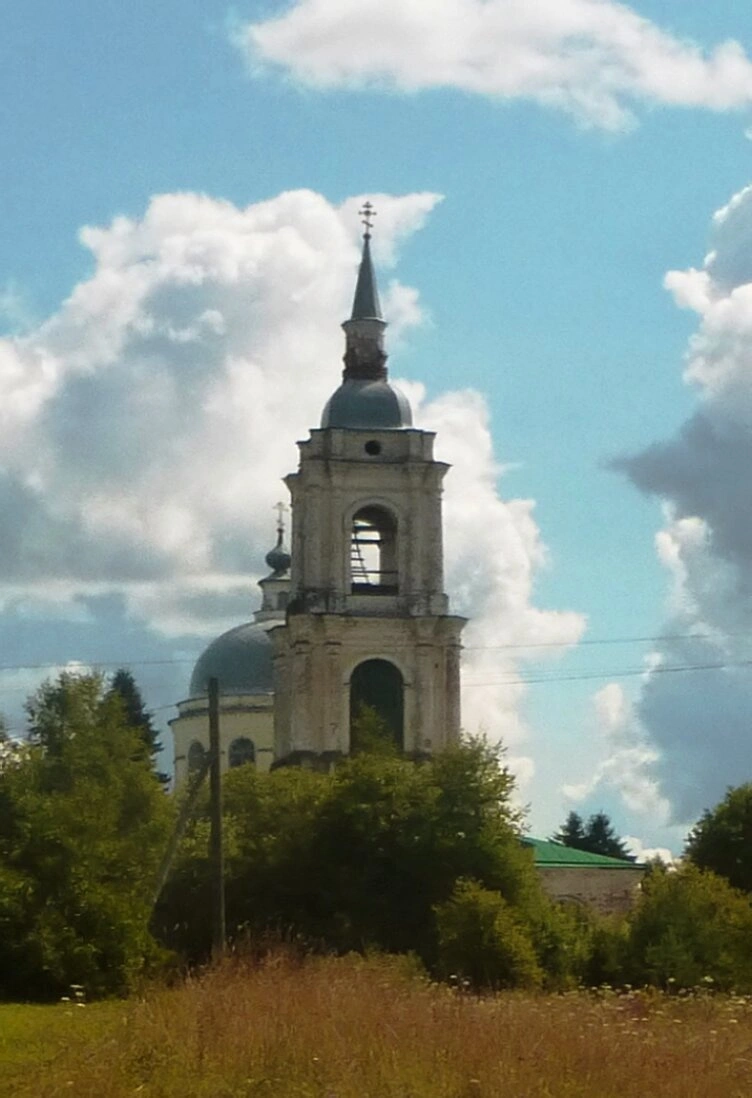 Высокая колокольня, увенчанная стройным шпилем с православным крестом, dominates архитектурной композицией. Рядом просматривается купол основного храма, завершающийся традиционной главкой. Здания выполнены в светлых тонах, что характерно для многих православных храмов Русского Севера.