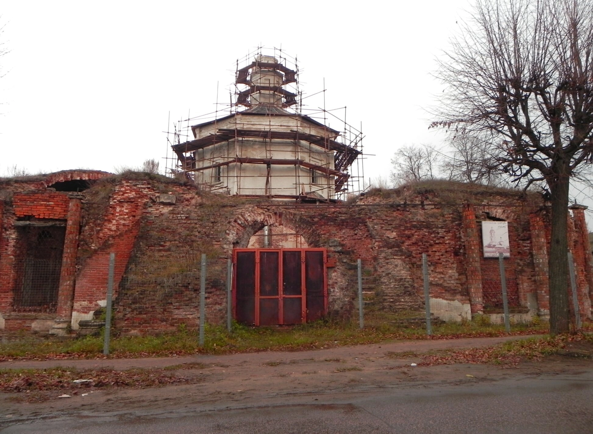 В момент съёмки храм находится на активном этапе реставрации, о чём красноречиво свидетельствуют установленные строительные леса вокруг светового барабана и главки. Нижний ярус здания, сложенный из красного кирпича, демонстрирует признаки ветхости и требует внимания реставраторов. В то же время верхняя часть, увенчанная золочёной главкой с крестом, а также колокольня, выглядят существенно лучше, что говорит о последовательном проведении восстановительных работ.