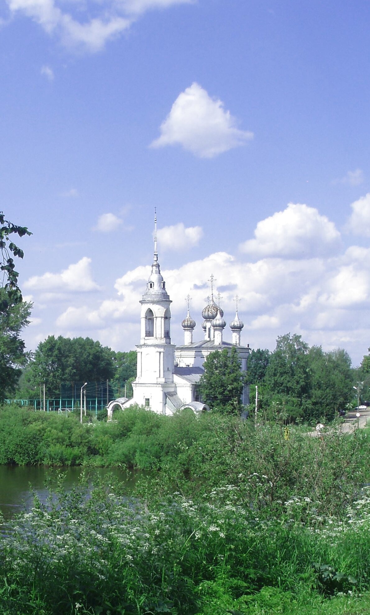 Белоснежные стены церкви и изящная колокольня, увенчанная золочёной главкой с крестом, ярко выделяются на фоне ясного неба с кучевыми облаками. Основной объём храма завершается мощным пятиглавием, где центральный купол, символизирующий Христа, доминирует над четырьмя меньшими, олицетворяющими евангелистов. Данный архитектурный приём является классическим для русского церковного зодчества.