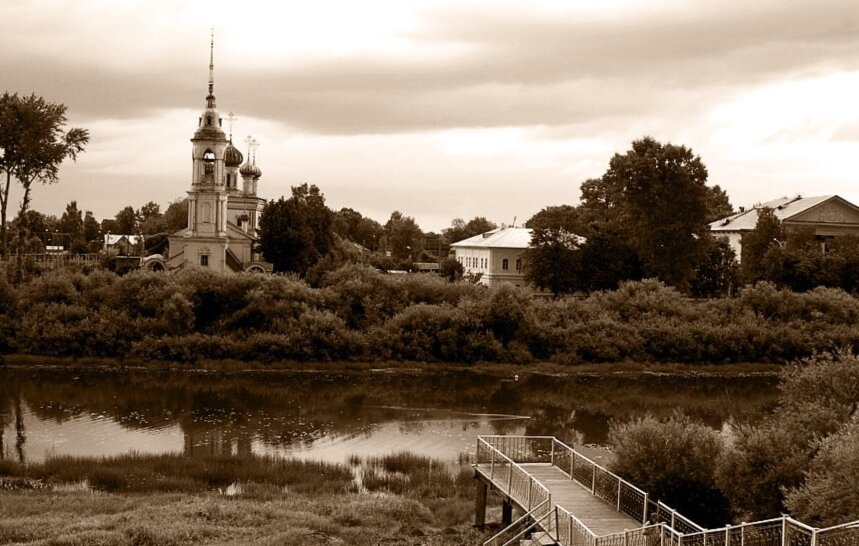 Небеса, затянутые облаками, окутывают светоносный храм мягким, рассеянным светом, что придаёт изображению особую глубину и лиричность. Сепийный оттенок фотографии напоминает о богатой истории этого места, придавая снимку характер исторической документальной ценности. Этот образ навевает мысли о вечных ценностях, тишине и молитвенной сосредоточенности, свойственных древним вологодским обителям.