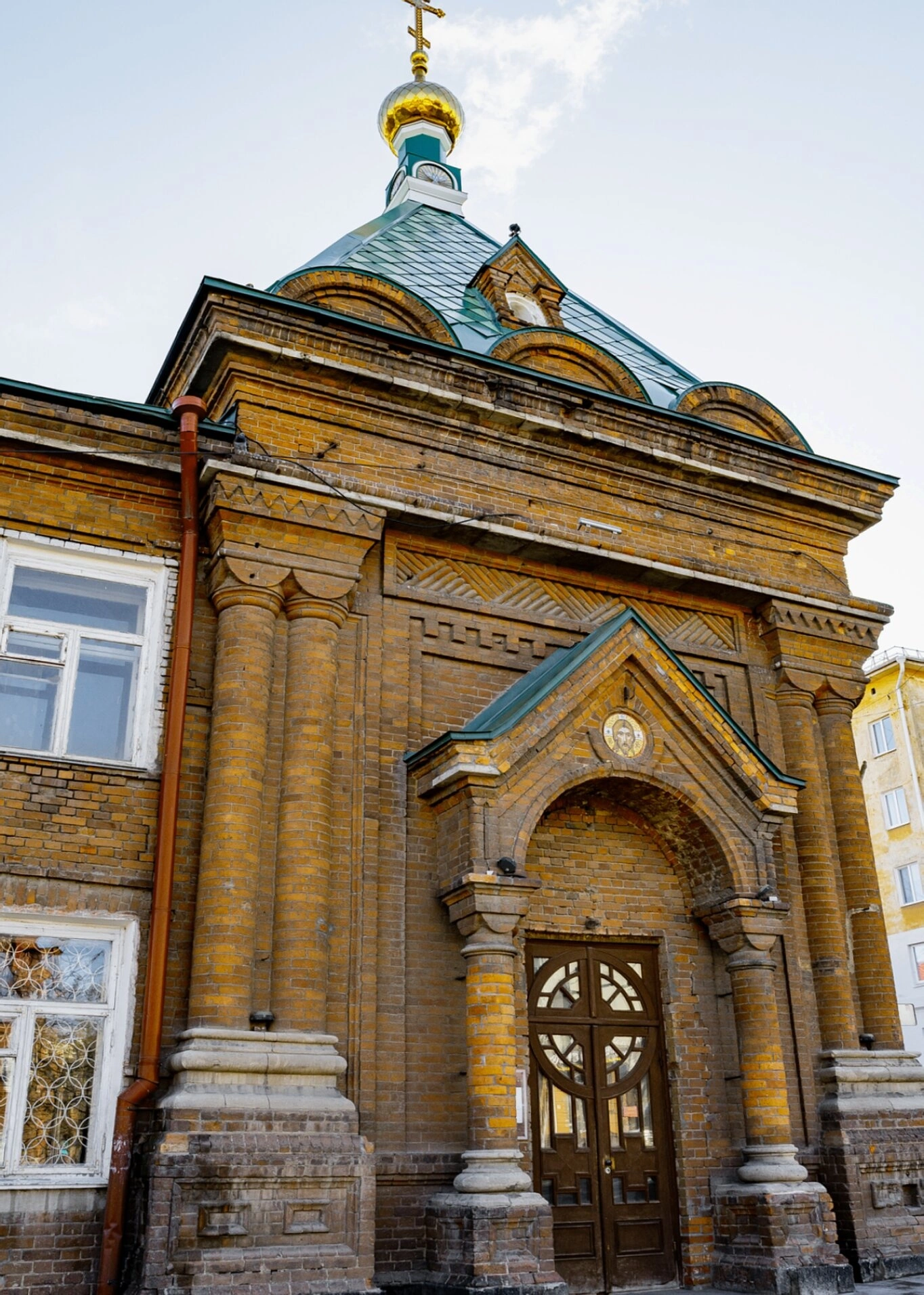 Венчает строение кровля бирюзово-зелёного цвета, покрытая, вероятно, металлочерепицей. Над центральной частью возносится золотистый луковичный купол, увенчанный православным крестом, который символически устремляет взор в небеса. По сторонам фасада видны оконные проёмы с белыми рамами, причём нижнее окно дополнительно защищено ажурной металлической решёткой с узором.