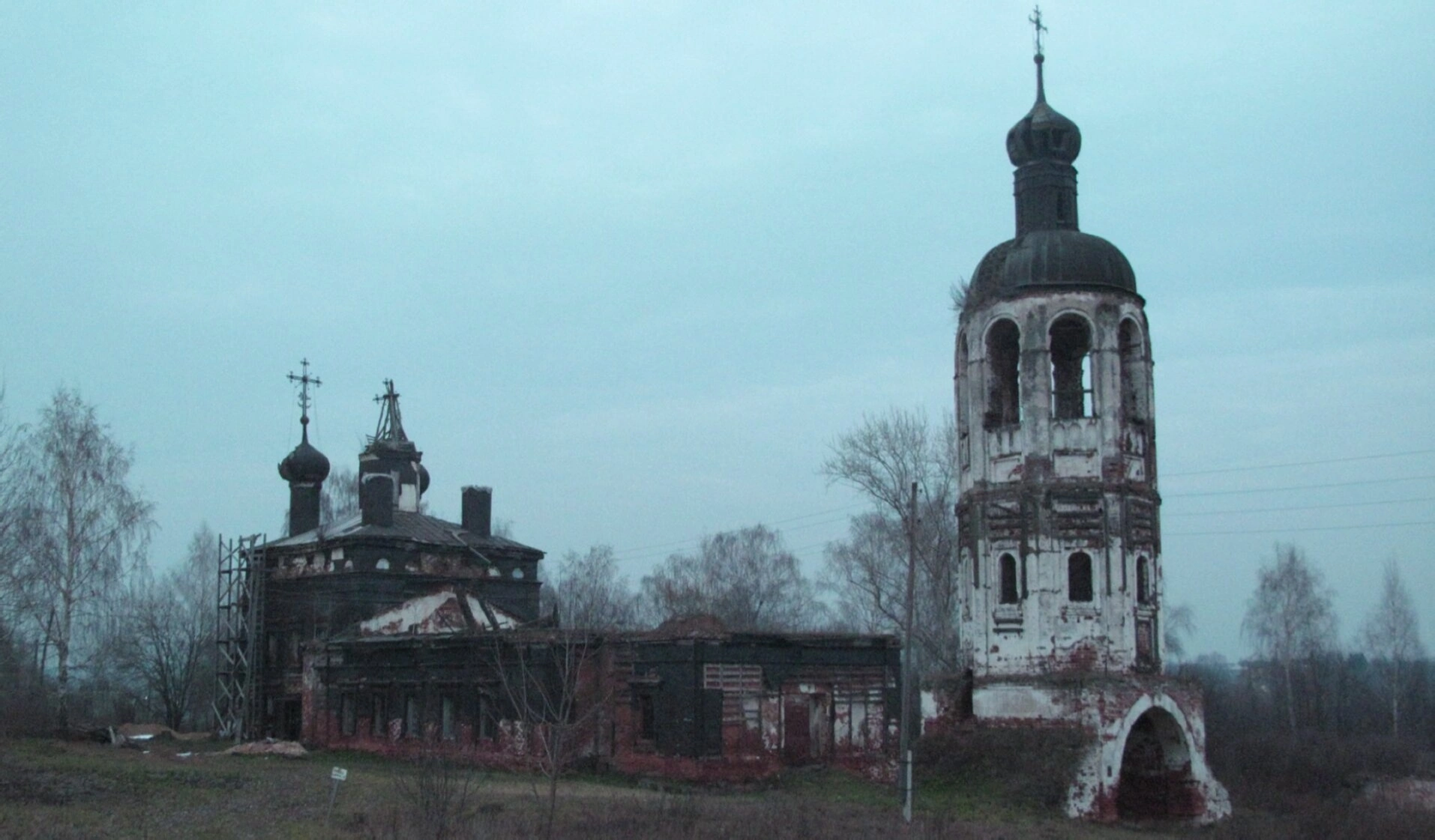 Архитектурный облик храма, даже в нынешнем разрушенном состоянии, позволяет различить черты традиционного русского церковного зодчества. На фотографии просматриваются остатки апсиды, где располагался алтарь — самое святое место храма, а также фрагменты несущих стен и оконных проёмов. Природа постепенно возвращает своё пространство, что придаёт месту особую, пронзительную красоту и напоминает о тленности всего земного.