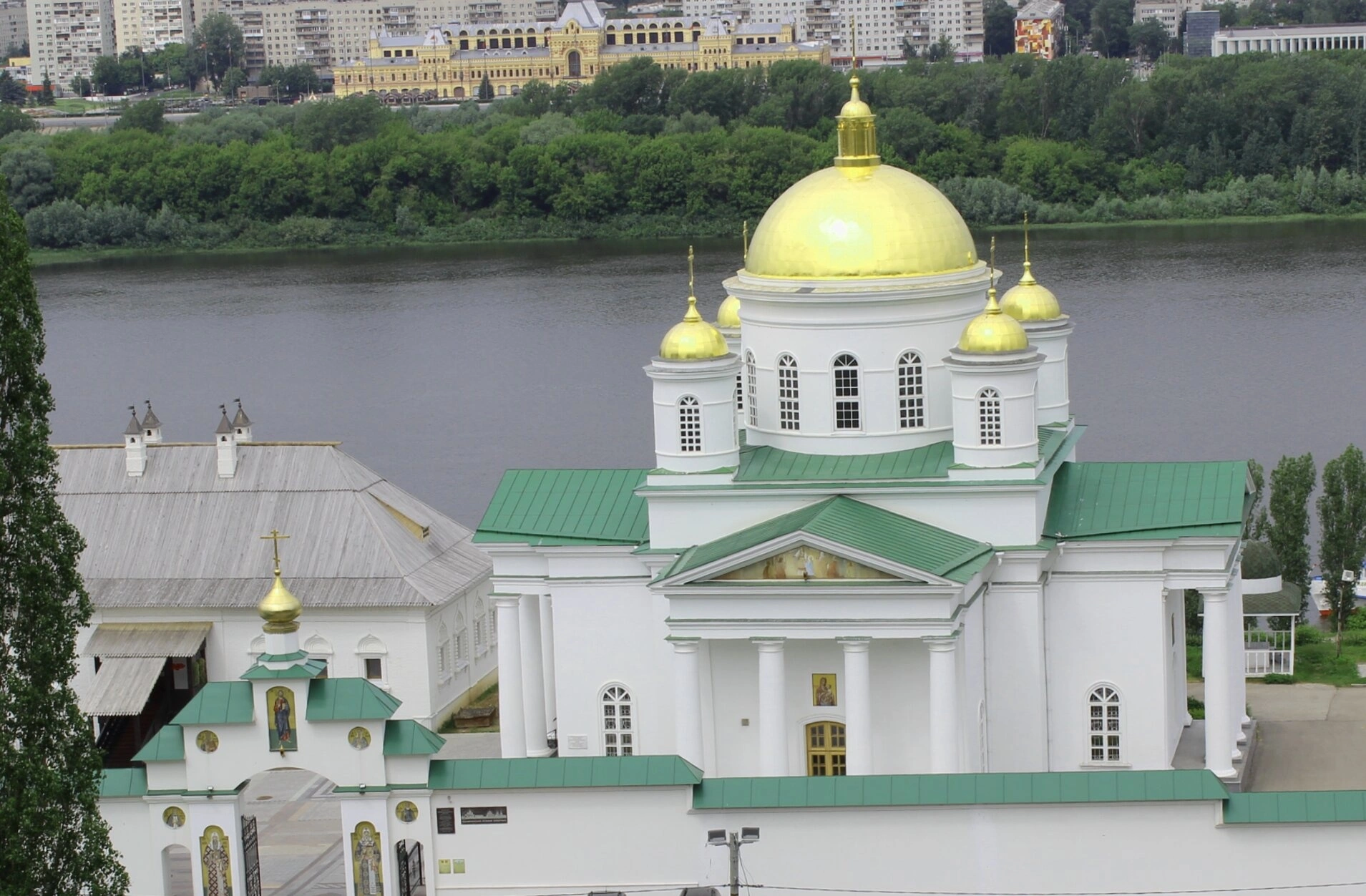 На представленной фотографии запечатлён храм в честь святителя Алексия, митрополита Московского, являющийся частью ансамбля Нижегородского Благовещенского мужского монастыря. Святыня расположена на живописном берегу реки, в историческом центре города, где воды Оки встречаются с Волгой.