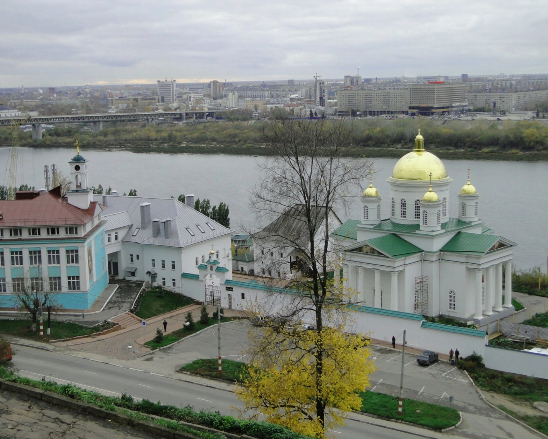 Данная фотография позволяет оценить не только архитектурные достоинства храма, но и его выгодное расположение на высоком берегу Оки, что historically обеспечивало стратегическую значимость монастыря в системе обороны города и подчёркивало его духовное значение в жизни Нижегородской земли.
