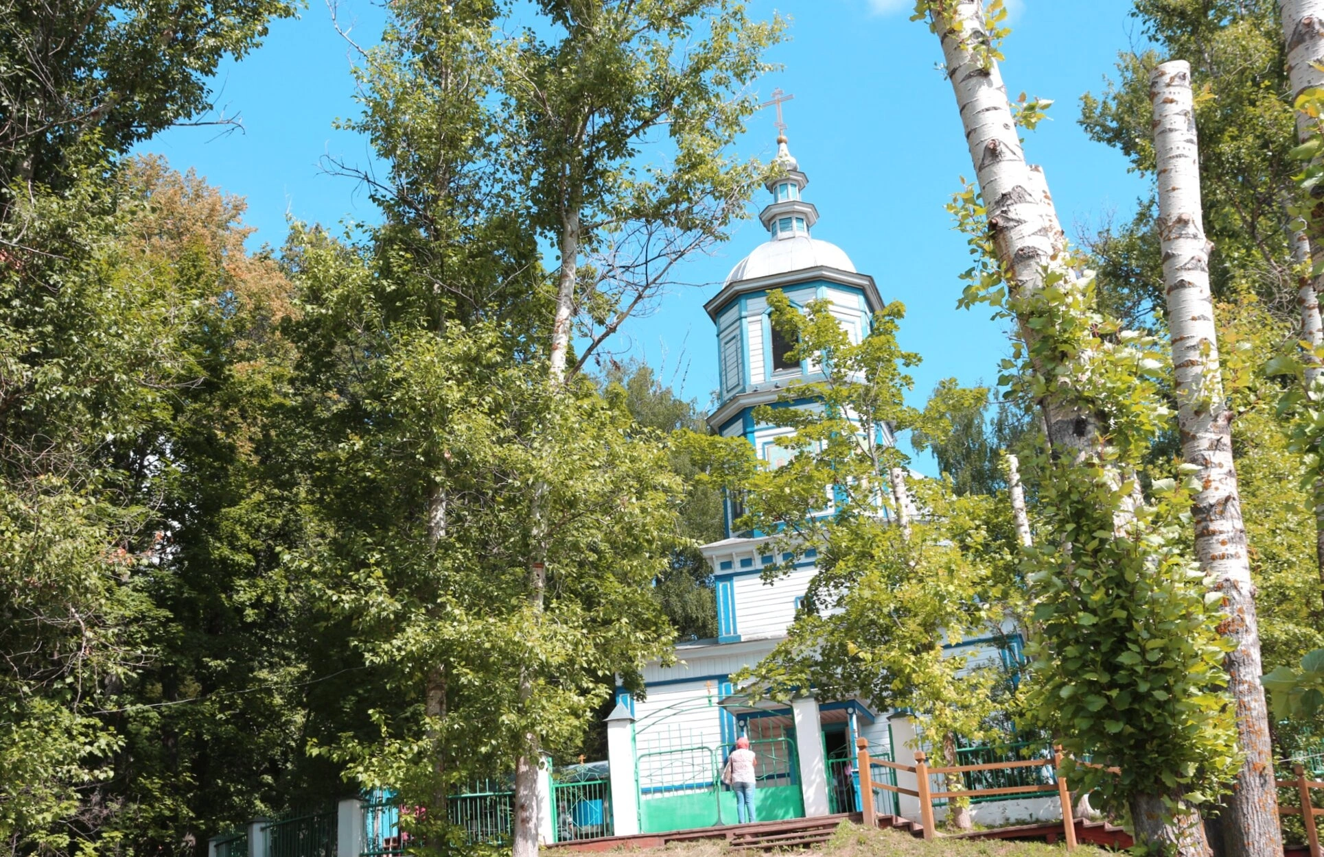 На фотографии запечатлена Церковь святителя Гурия, архиепископа Казанского, расположенная между деревнями Петъял и Азъял в Волжском районе Республики Марий Эл. Этот деревянный храм, обшитый тесом, был построен в 1896 году и является значимым памятником православной культуры региона.