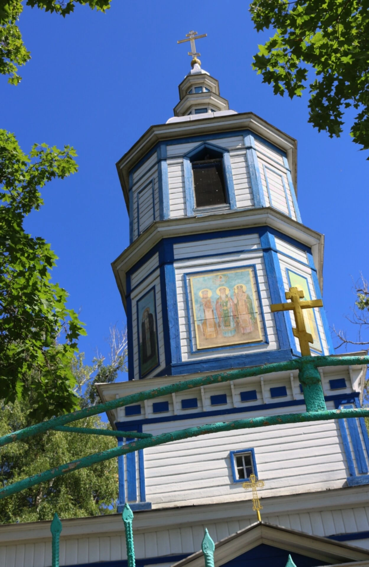 Бело-голубой храм гармонично вписан в природный ландшафт, стоя у подножия холма в окружении деревьев. На снимке хорошо видна стройная колокольня, увенчанная православным крестом, который устремляется в небо, символизируя молитвенное предстояние. На фасаде здания различима икона, что свидетельствует о традиционном для русского храмостроения оформлении.