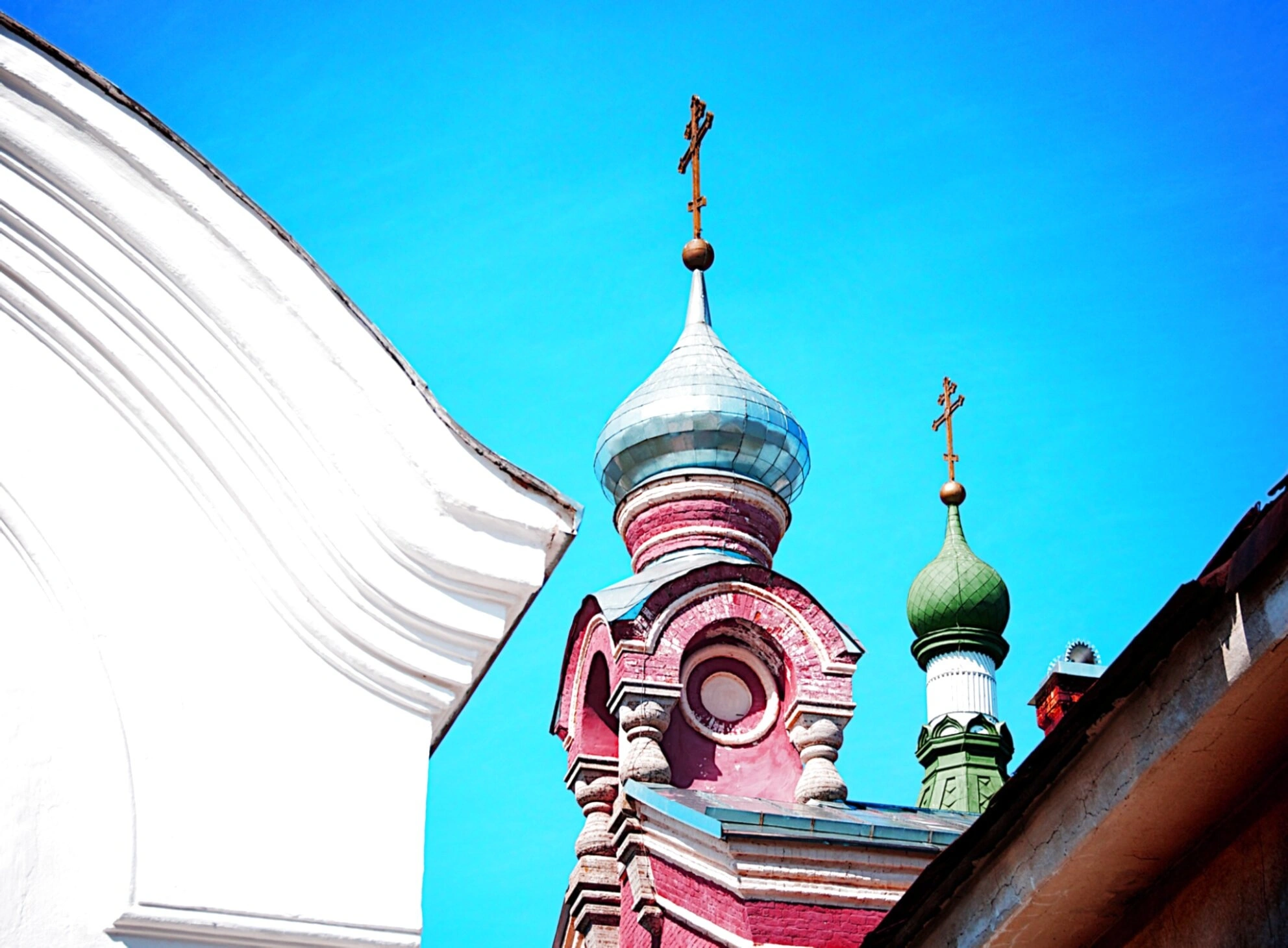 Архитектура храма отражает традиции русского церковного зодчества. На фотографии видны купола, увенчанные крестами — символом христианской веры и искупительной жертвы Спасителя. Эти купола, устремленные в небеса, напоминают верующим о горнем мире и вечной жизни во Христе.