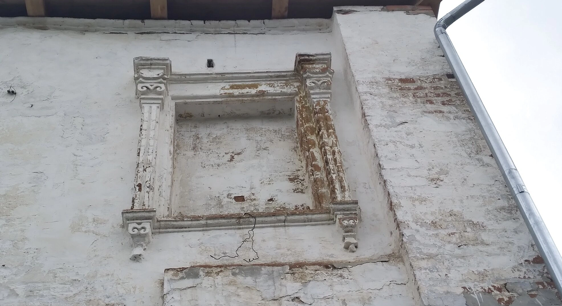 Стена храма, сложенная из красного кирпича, местами покрыта осыпающейся белой штукатуркой, что свидетельствует о длительном отсутствии реставрационных работ. В верхней части композиции просматриваются элементы деревянного перекрытия, а вдоль стены проходит металлическая водосточная труба — деталь, появившаяся в более поздний период существования здания.