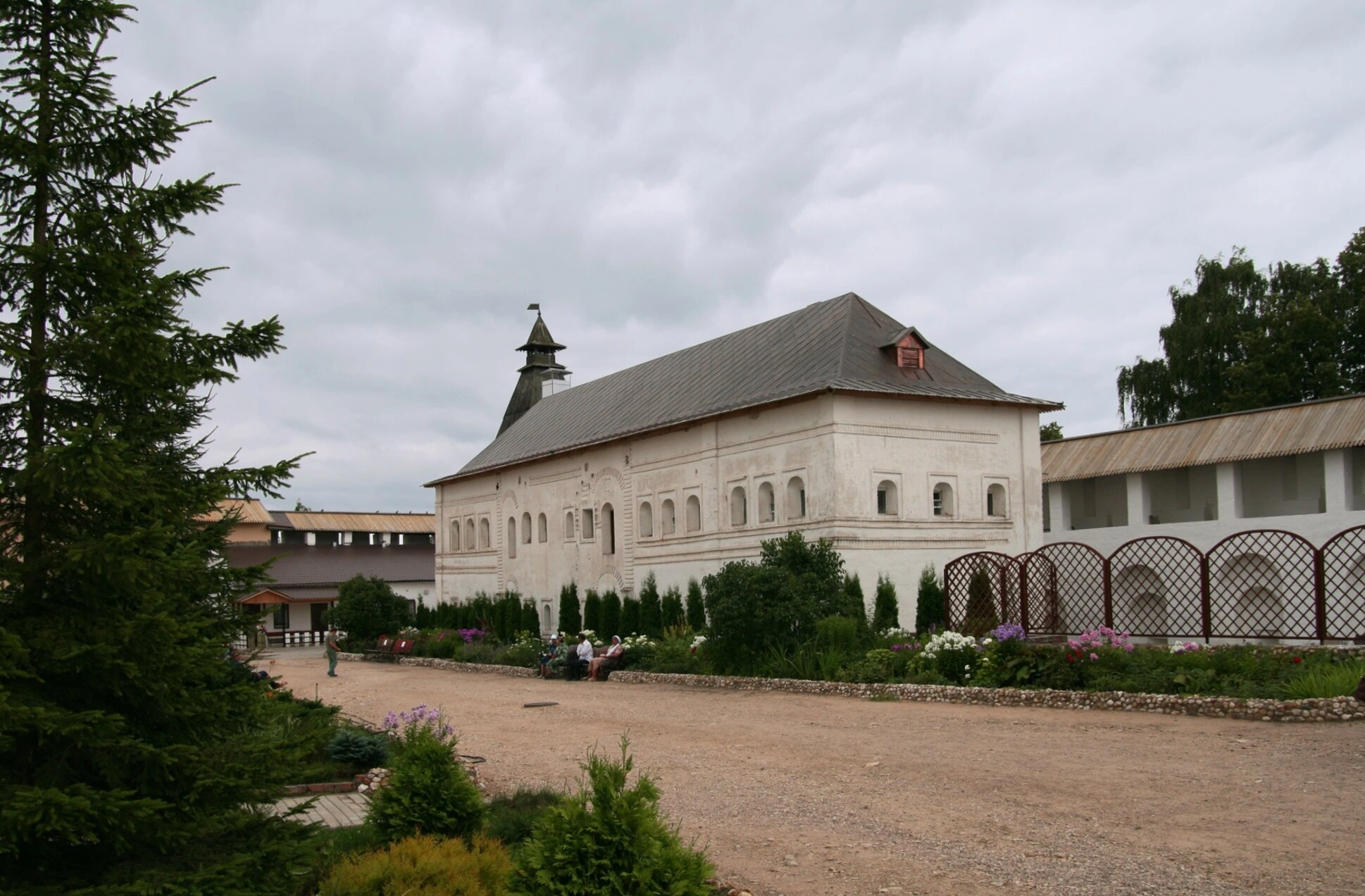 На представленной фотографии запечатлена церковь святителя Митрофана, епископа Воронежского, расположенная на территории Свято-Пафнутьева Боровского монастыря в городе Боровске Калужской области. Храмовая постройка относится к комплексу братских келий монастыря и является важной частью архитектурного ансамбля этой древней православной обители.