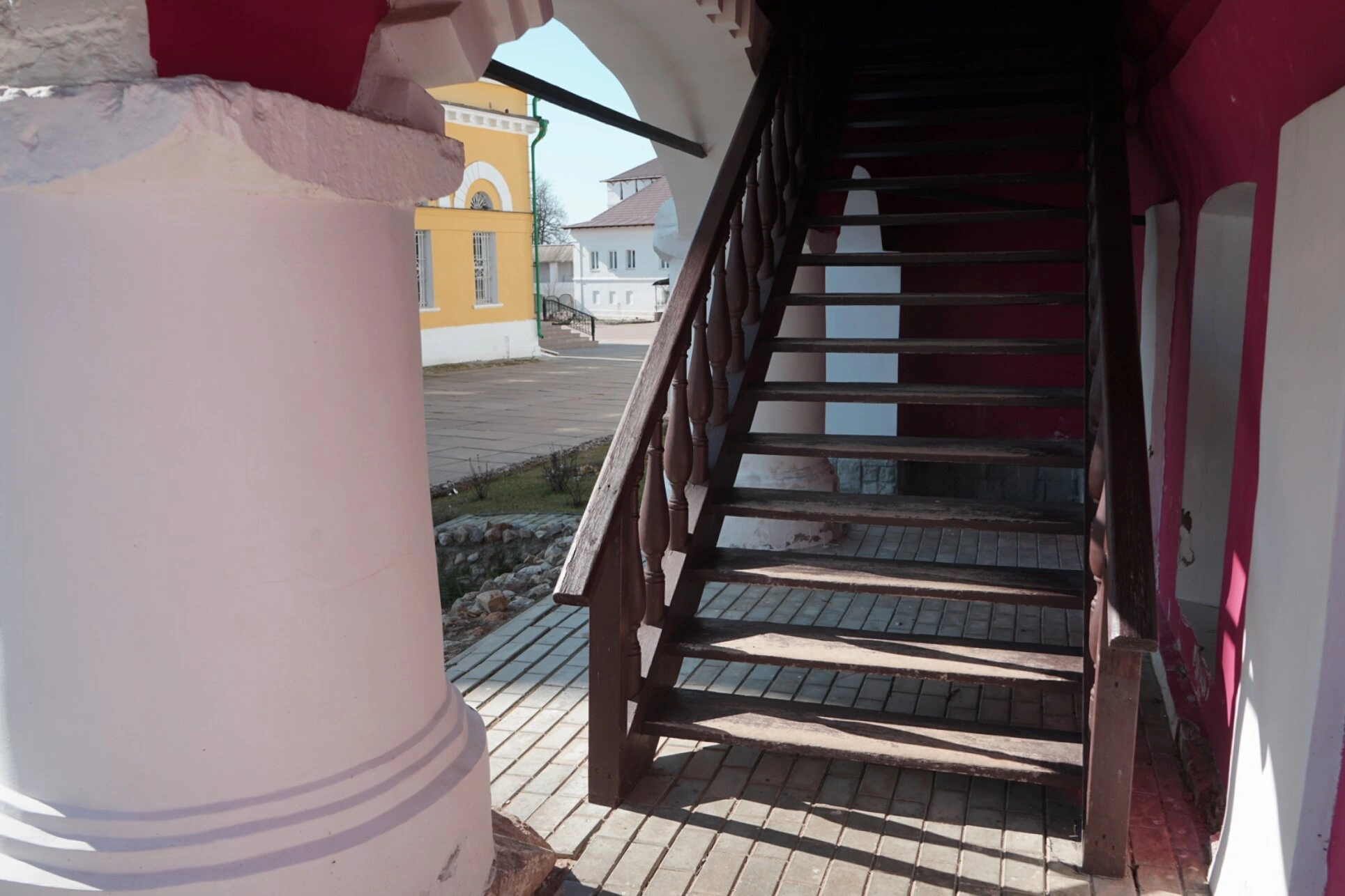 Композиция снимка выстроена вокруг массивной деревянной лестницы с искусно выполненными резными балясинами и перилами, ведущей ко входу в храмовое помещение. Лестничный марш, отбрасывающий чёткие тени на каменную брусчатку, создаёт особый ритмический рисунок, подчёркивающий монументальность архитектурного решения.