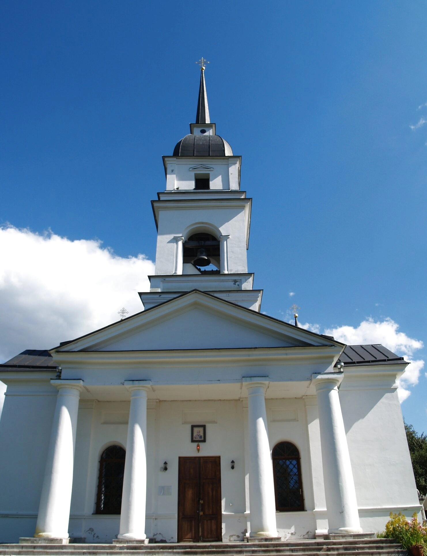 Фасад здания украшают изящные колонны, обрамляющие входную группу, и арочные оконные проёмы, характерные для русской храмовой архитектуры. К главному входу ведёт каменная лестница, символизирующая духовное восхождение верующих к молитве и таинствам. Колокольня с высоким шпилем служит не только архитектурной доминантой, но и голосом церкви, созывающим православных на богослужение.