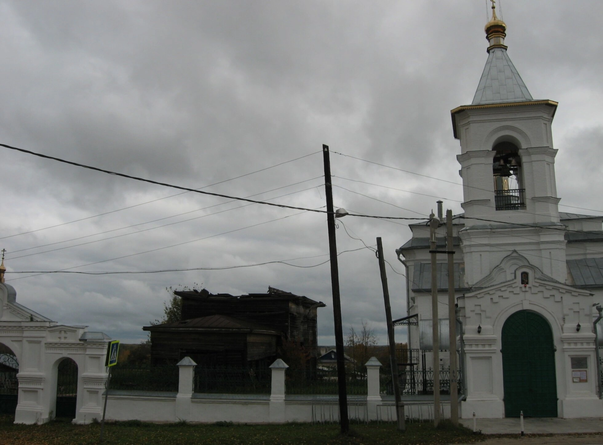 С левой стороны от храма visible часть церковной ограды с арочными воротами, ведущими на территорию храмового комплекса. За оградой просматривается старинное деревянное здание, вероятно относящееся к церковным постройкам. На переднем плане заметны деревянные столбы с электропроводами, что свидетельствует о современном благоустройстве территории.