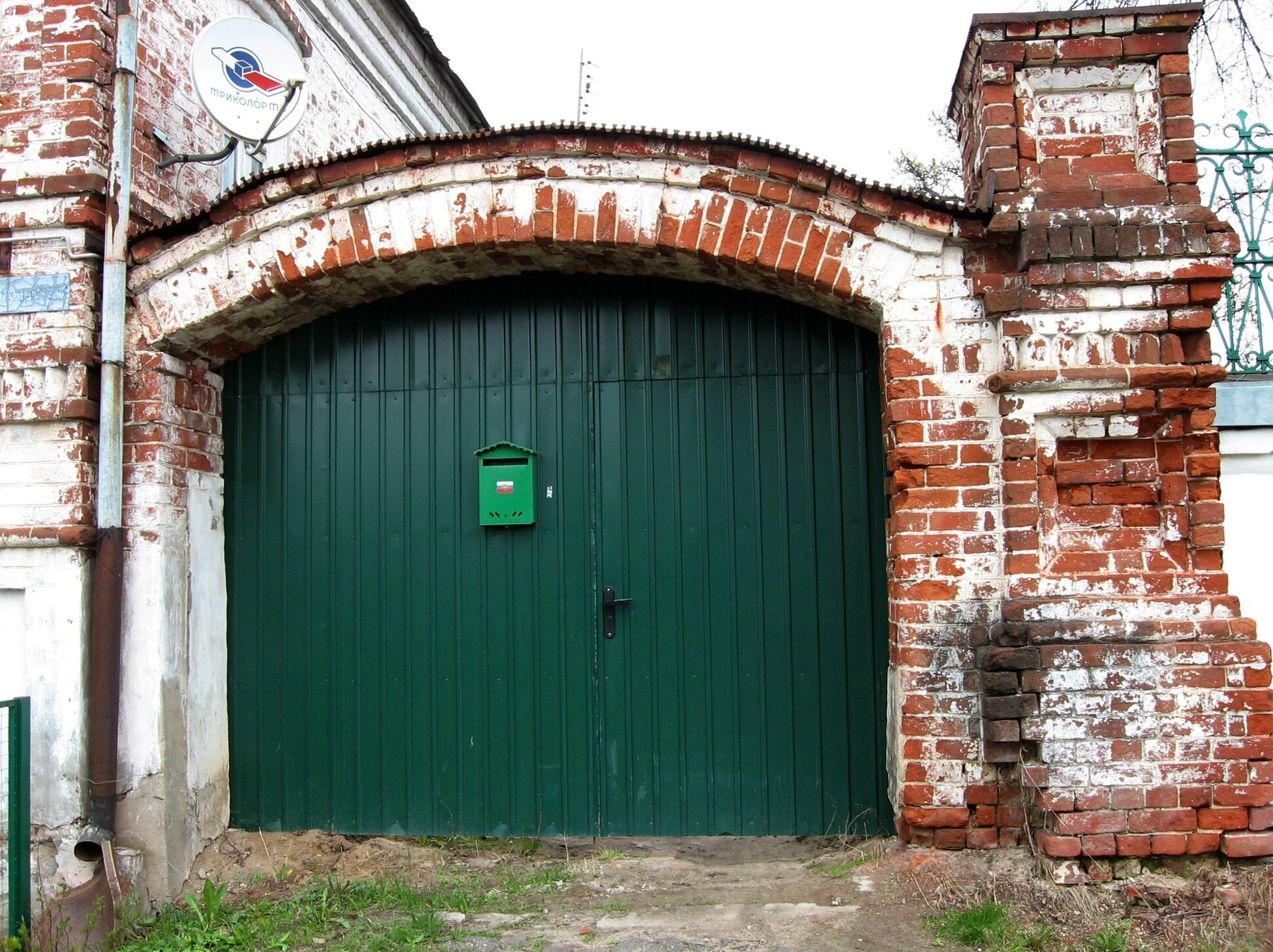 Архитектурная композиция демонстрирует массивную кирпичную арку с полукруглым сводом, выполненную из красного кирпича. Часть кладки оштукатурена и побелена, что характерно для традиционного церковного зодчества. Металлические секционные ворота, окрашенные в тёмно-зелёный цвет, украшены прямоугольным почтовым ящиком аналогичного оттенка.