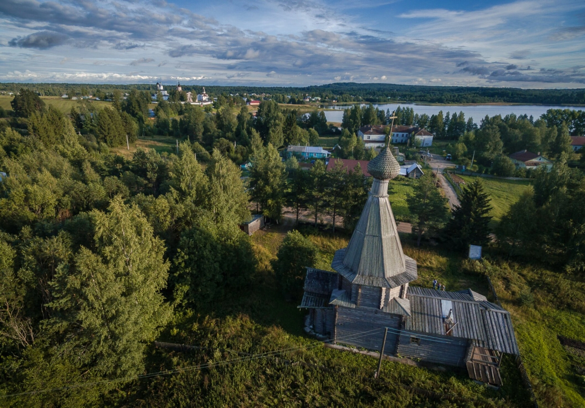 На представленной фотографии запечатлён уникальный вид на православную святыню Русского Севера — Церковь Святителя Николая Чудотворца в деревне Пурнема, расположенную в Вологодской области. Храм возвышается на живописном берегу озера Бородаевского, являя собой образец традиционного деревянного зодчества. На дальнем плане, в лучах небесного света, величаво располагается ансамбль Ферапонтова Белозерского монастыря, объект Всемирного наследия ЮНЕСКО.
