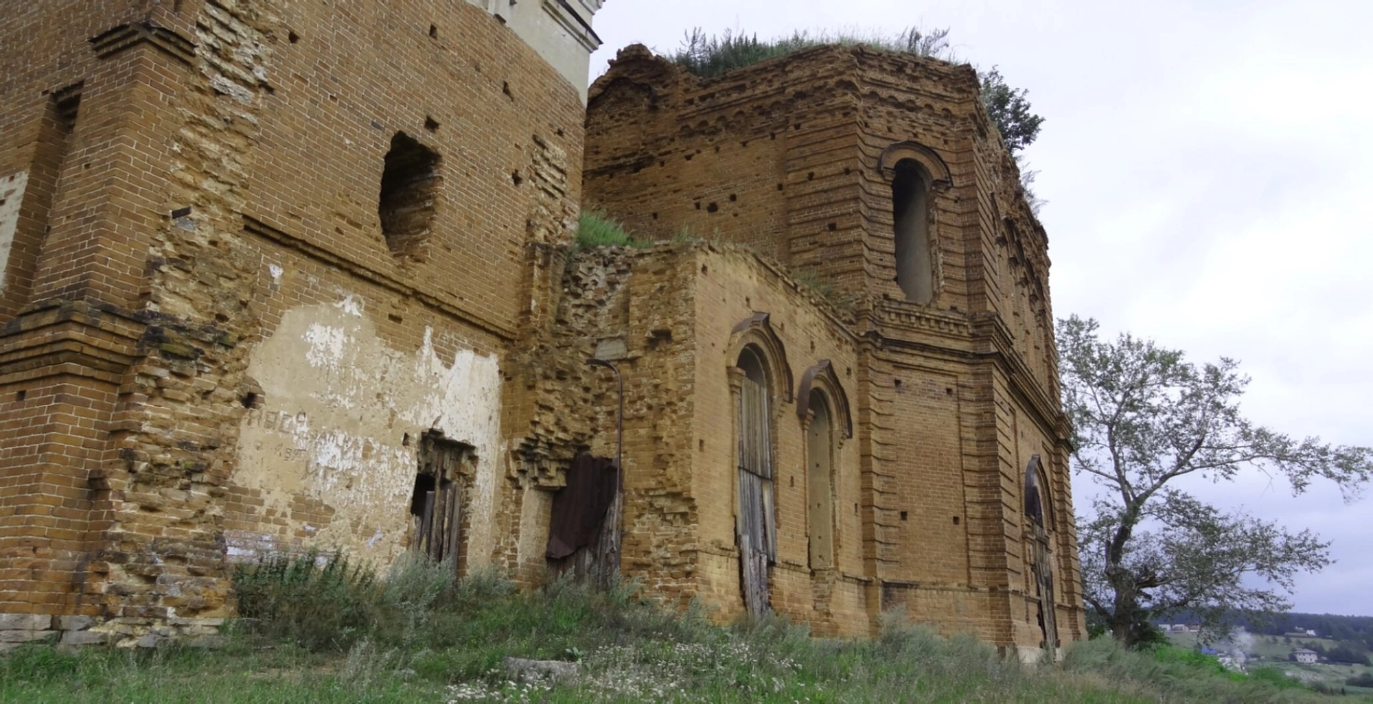 Природа постепенно поглощает творение рук человеческих: высокая трава и кустарники подступают к стенам, а на вершине одной из уцелевших конструкций проросли деревца, что символизирует неумолимое действие времени. На заднем плане виднеется холм и строения села, напоминая о том, что жизнь вокруг продолжается, несмотря на утрату духовного центра. Пасмурное небо усиливает ощущение утраты и скорби об утраченной святыне.