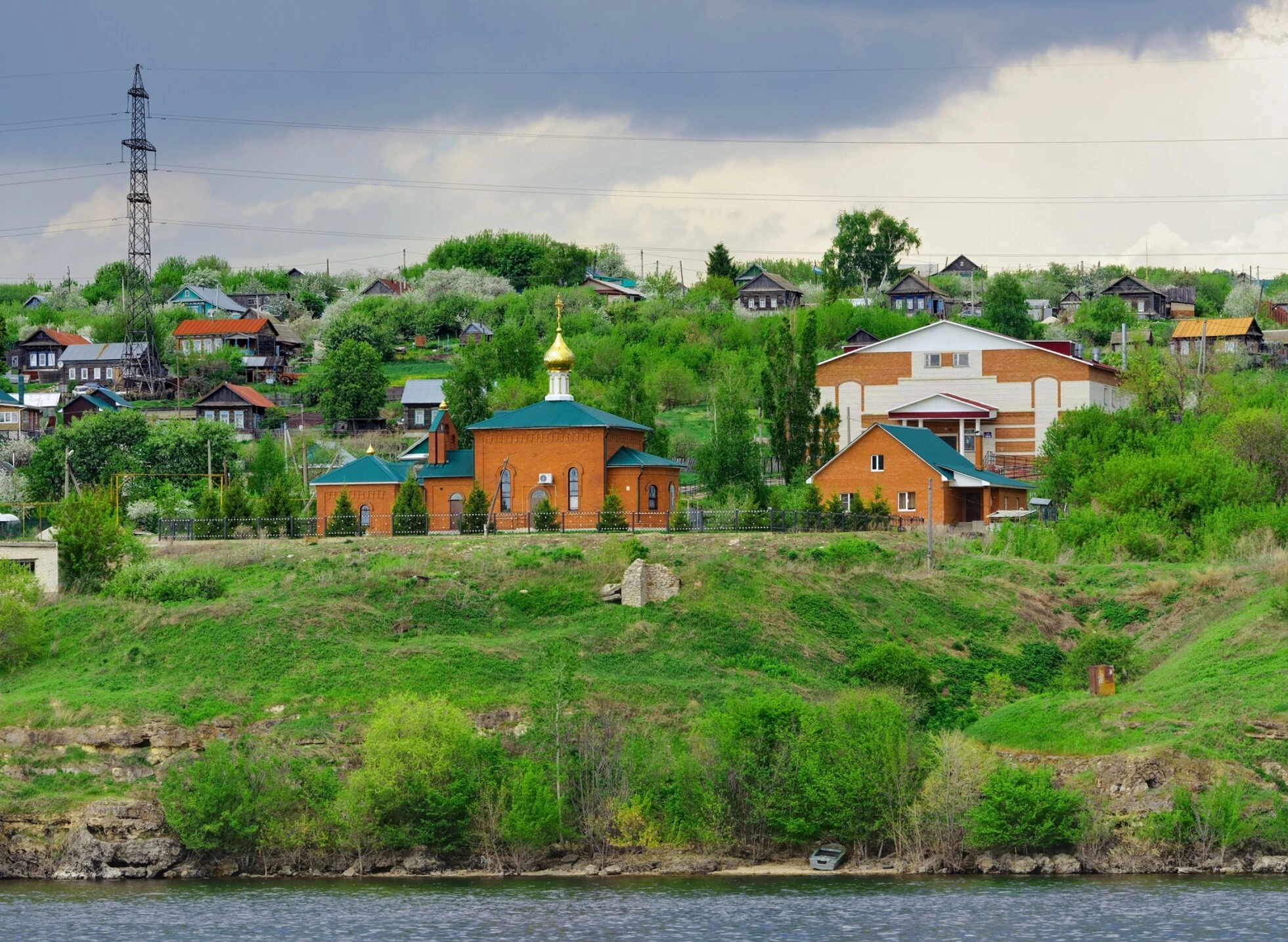 На фотографии запечатлен живописный вид на православный храм во имя святителя Николая Чудотворца, расположенный в старинном селе Печерское Сызранского района Самарской области. Святыня стоит на высоком берегу великой русской реки Волги, откуда открываются панорамные виды на водные просторы и окрестные холмы. Это место обладает особой духовной и исторической значимостью для всего Поволжья.