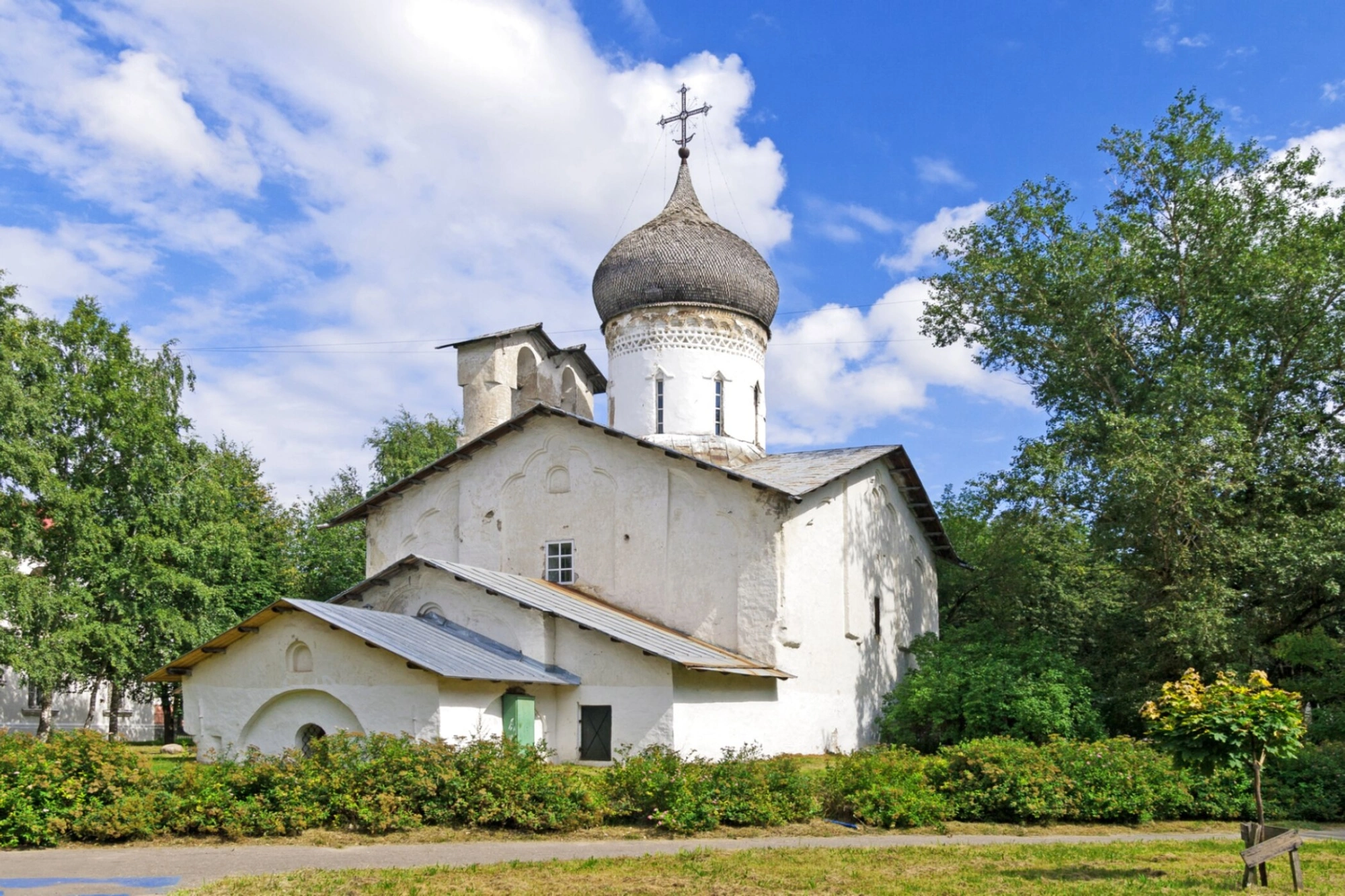 К основному объёму храма примыкают более поздние пристройки, включая притвор и крыльцо, которые органично вписываются в общую композицию. Строгая простота и монументальность форм сочетаются с изящным декором, создавая образ, исполненный благодати и духовной силы. Храмовой комплекс гармонично вписан в природный ландшафт и окружён зеленью деревьев, что подчёркивает его неразрывную связь с древней псковской землёй.